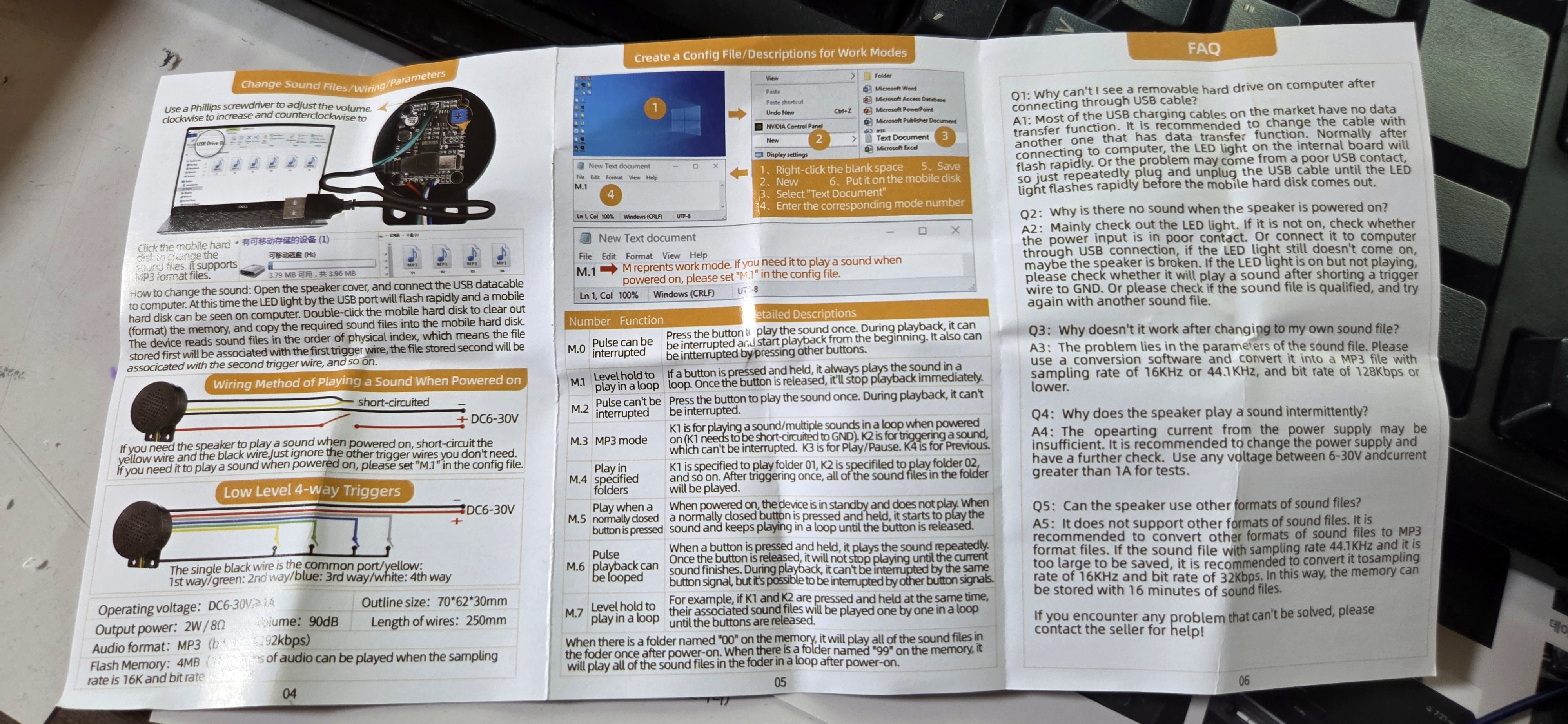 나머지 선은 싹 수축튜브로 감아주고 두 선만 연결하여 전원을 넣으니 내장된 중국어 멘트가 나오더랍니다. 5핀 케이블로 PC에 연결하면 32MB 수준의 내장메모리가 인식되는데, 그 내장메모리 안에 짧은 mp3 파일을 넣어주고, 메모장에 모드를 설정하면 됩니다.
