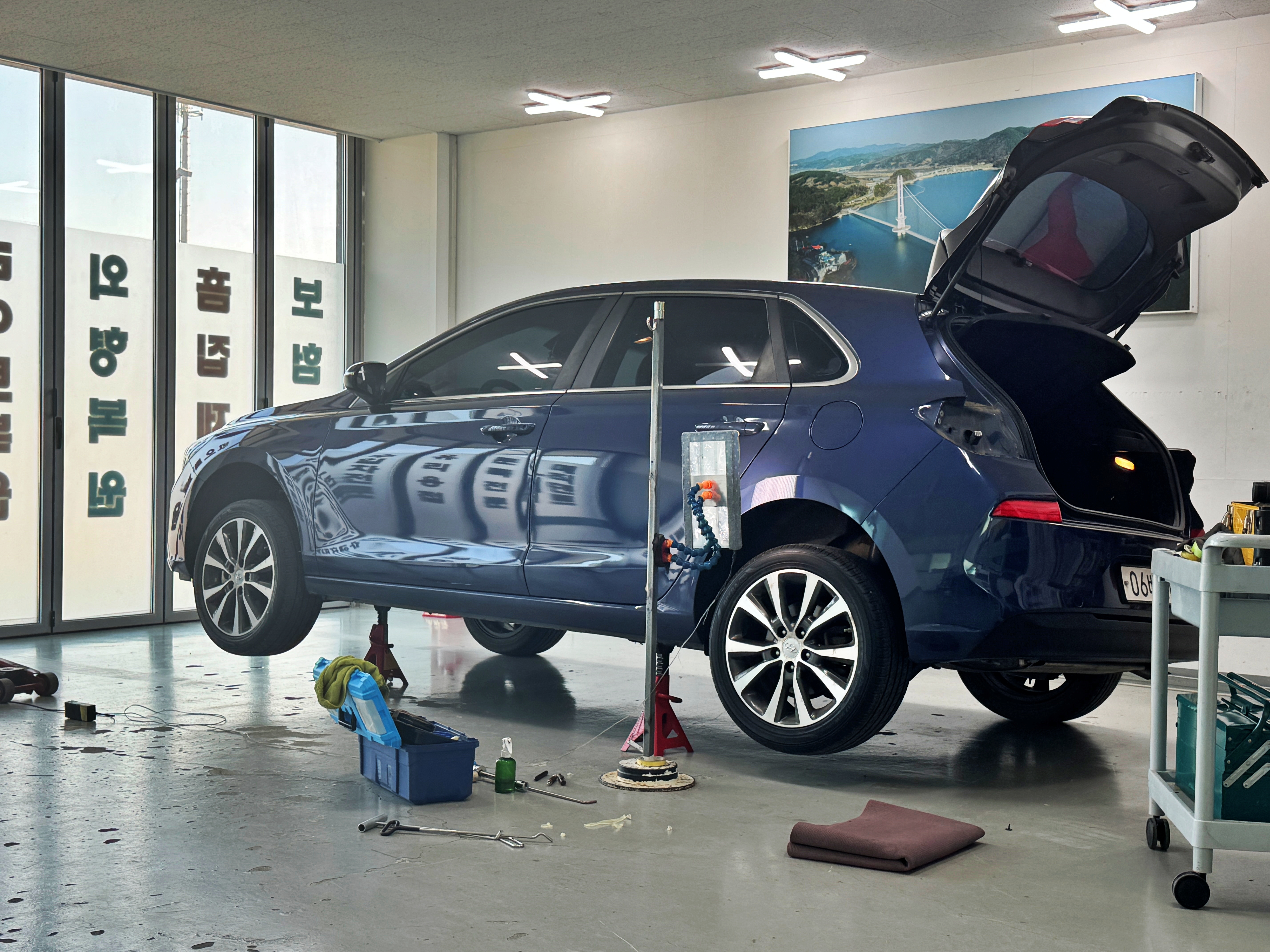 바로 문을 열고 차량을 후진으로 집어넣습니다. 그리고 사진으로 봤던것보다 더 심하다고 덴트로 가능할지 모르겠으나 일단 최대한 살려보시겠다고 하시네요. 그렇게 작업에 돌입합니다.