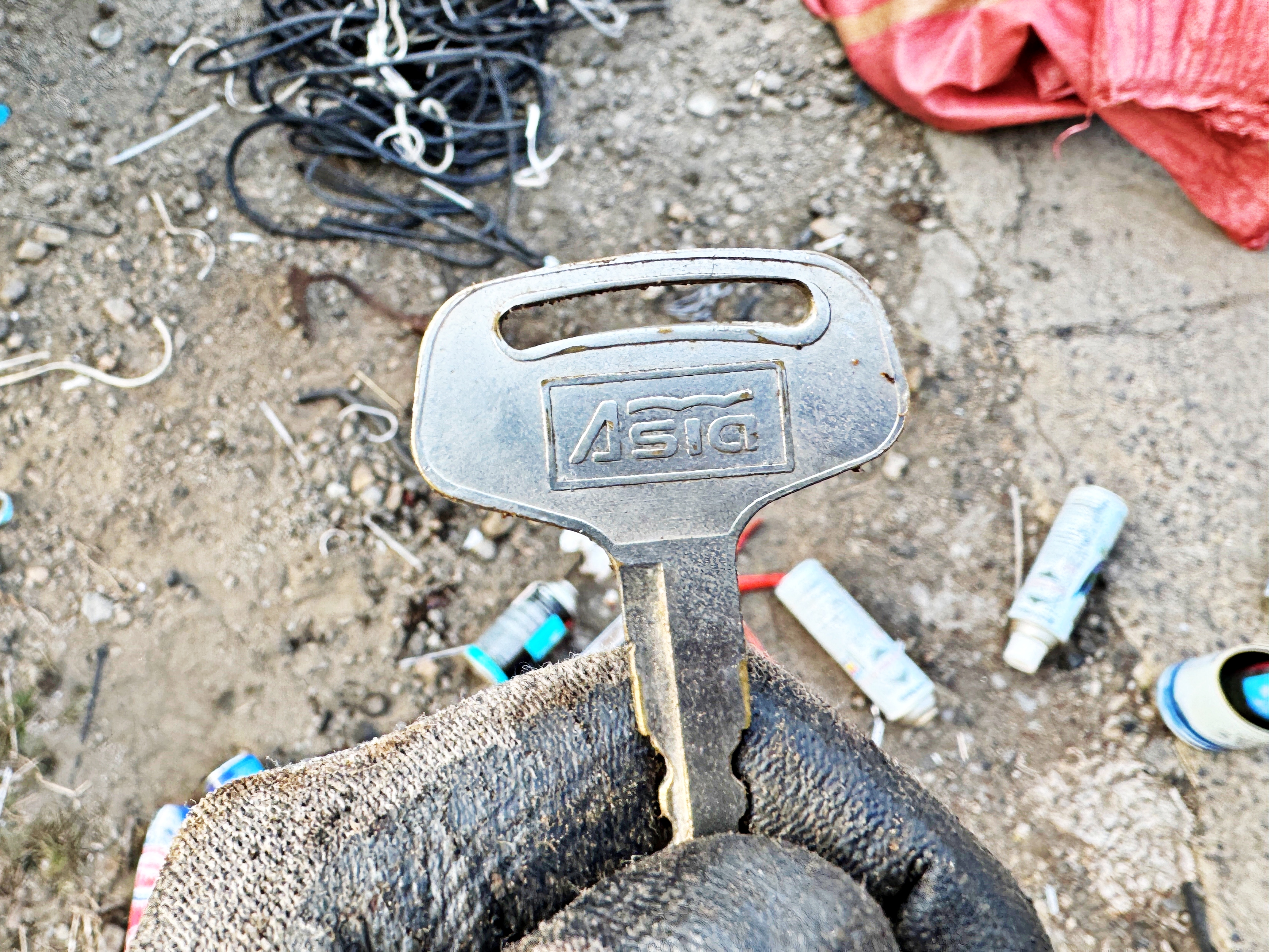 이 고물더미를 주신 분께 물어보니 예전에 농업용 트랙터를 사 왔을 때 트랙터 키에 같이 걸려있던 차키라고 합니다. 트랙터를 사온지도 꽤 시간이 흘렀고, 지금은 그 트랙터도 날렸으니 그냥 고철을 넣어두는 마대자루에 트랙터 키와 함께 이 아시아키도 함께 넣어 버린 거였죠.