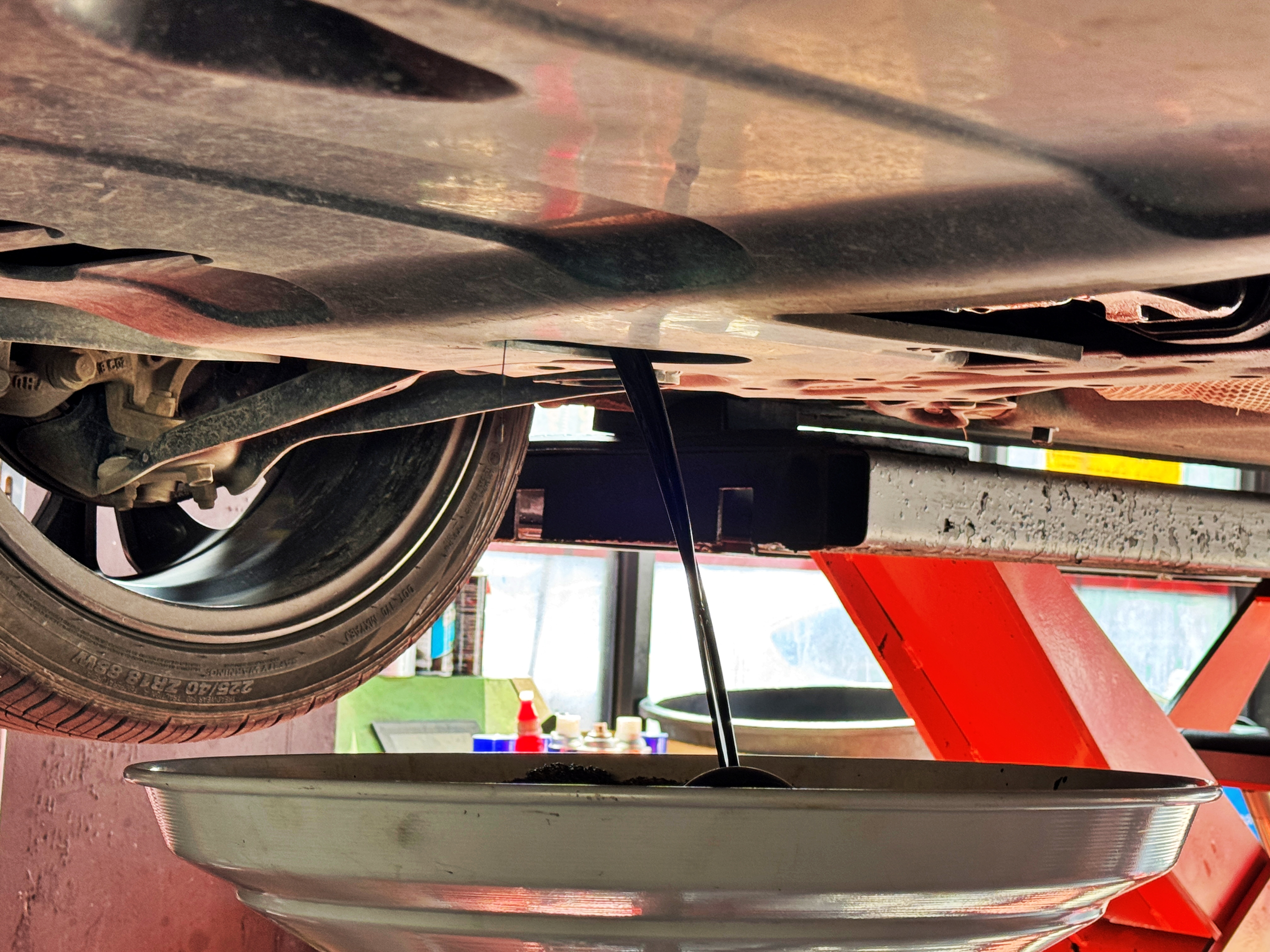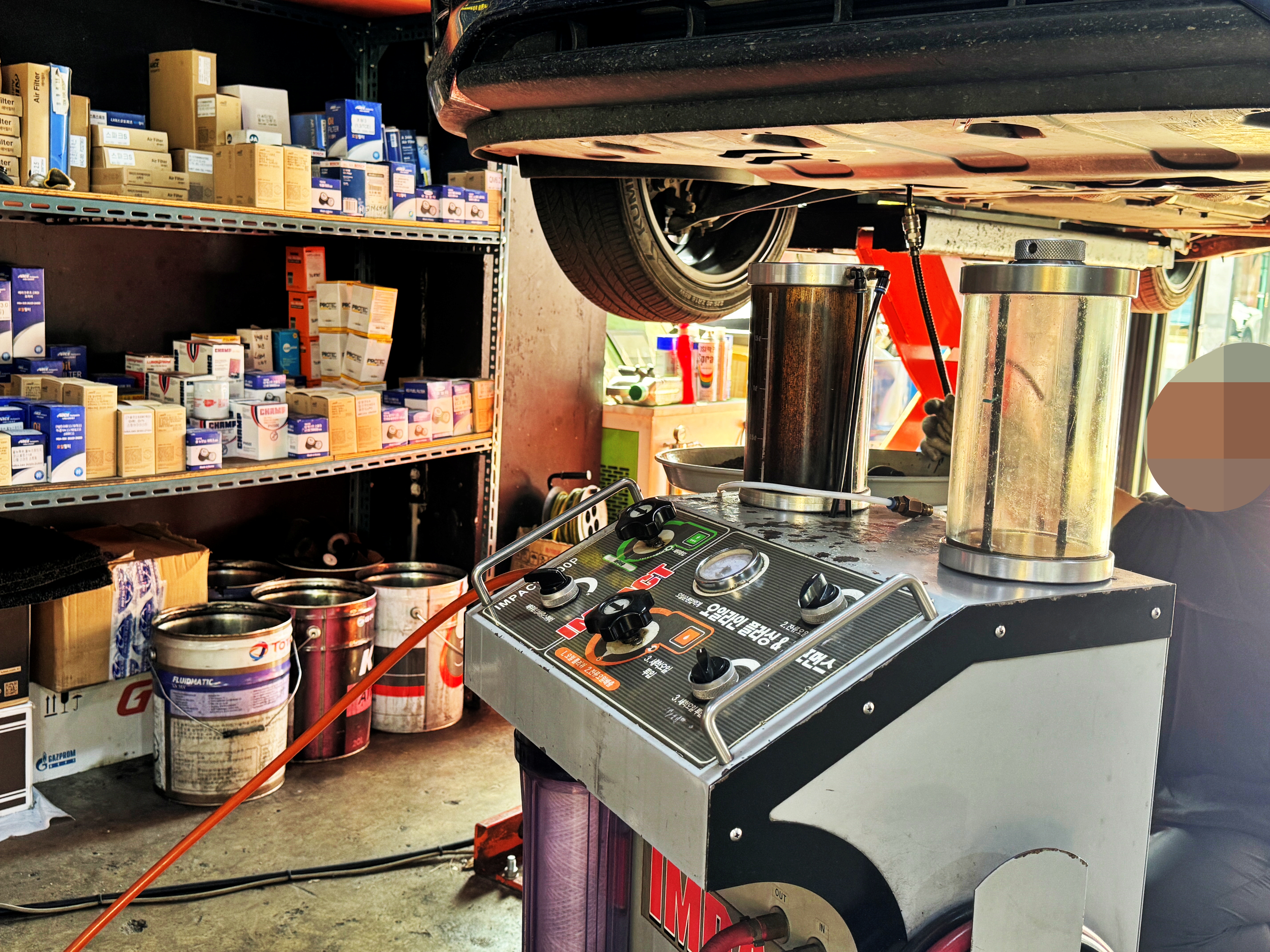 잔유를 이 장비로 빨아들인 뒤 리프트를 살짝 내리고 새 엔진오일 주입 작업을 진행합니다.