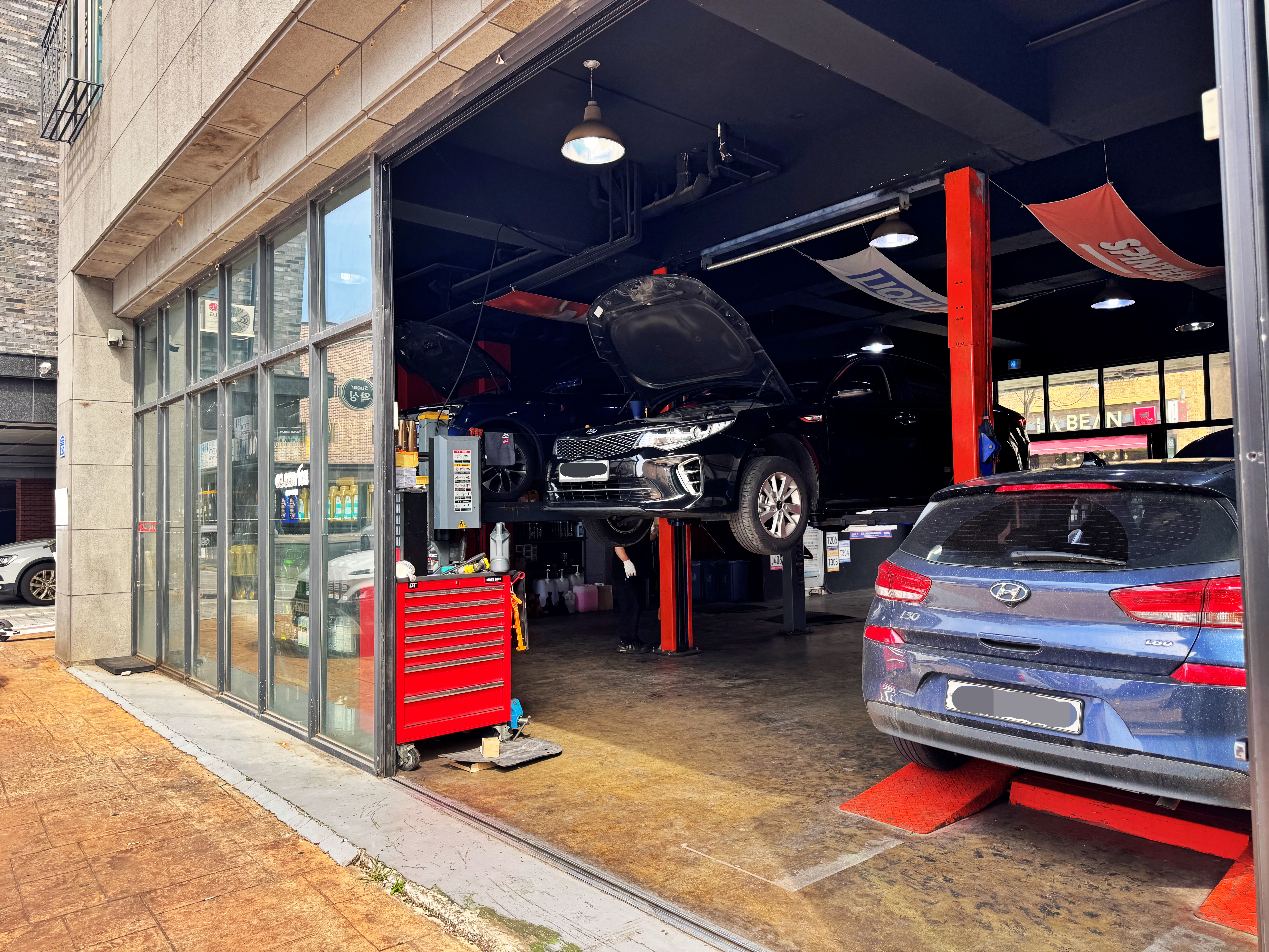 먼저 입고된 차량 두 대는 정문으로, 제 차가 올라가는 리프트는 후문으로 들어와야 한다고 합니다. 리프트는 총 세 대. 남들 다 쉬는 일요일임에도 아침 일찍 출근하여 열심히 일을 하고 계신 점장님 포함 총 세 분의 직원분께서 고군분투를 하고 계셨습니다.