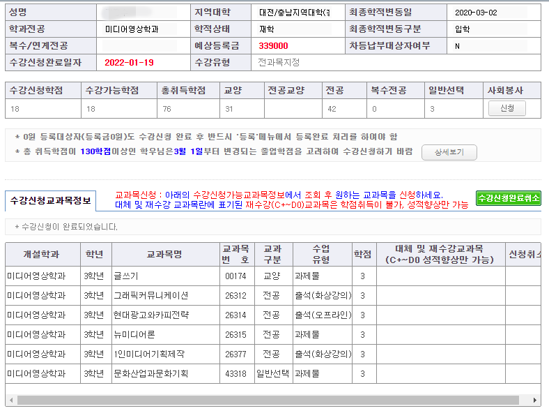 딱히 뺄 과목도 없고 넣을 과목도 없어서 그대로 신청했습니다.