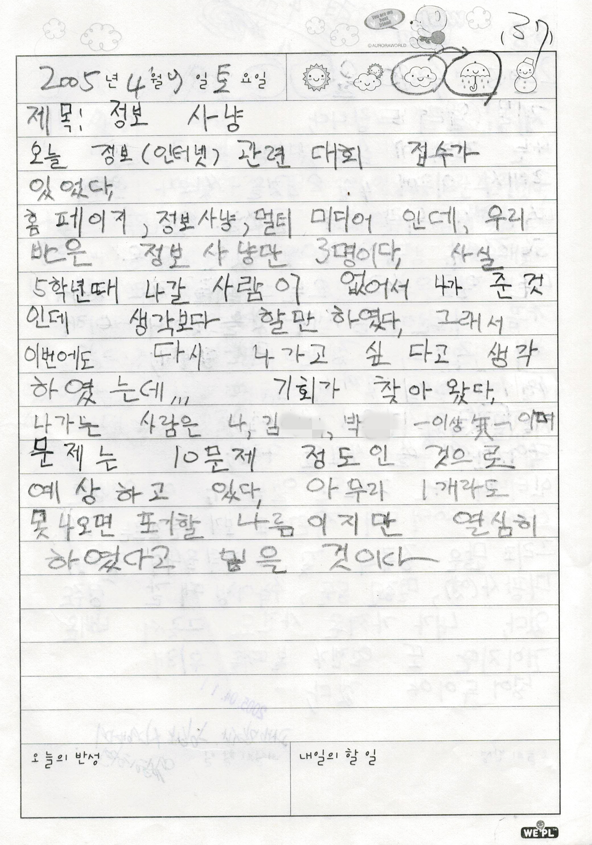 | [초딩일기] 2002년 5월 29일 제목 : 내 양말 빨기 (0) | 2022.01.04 |