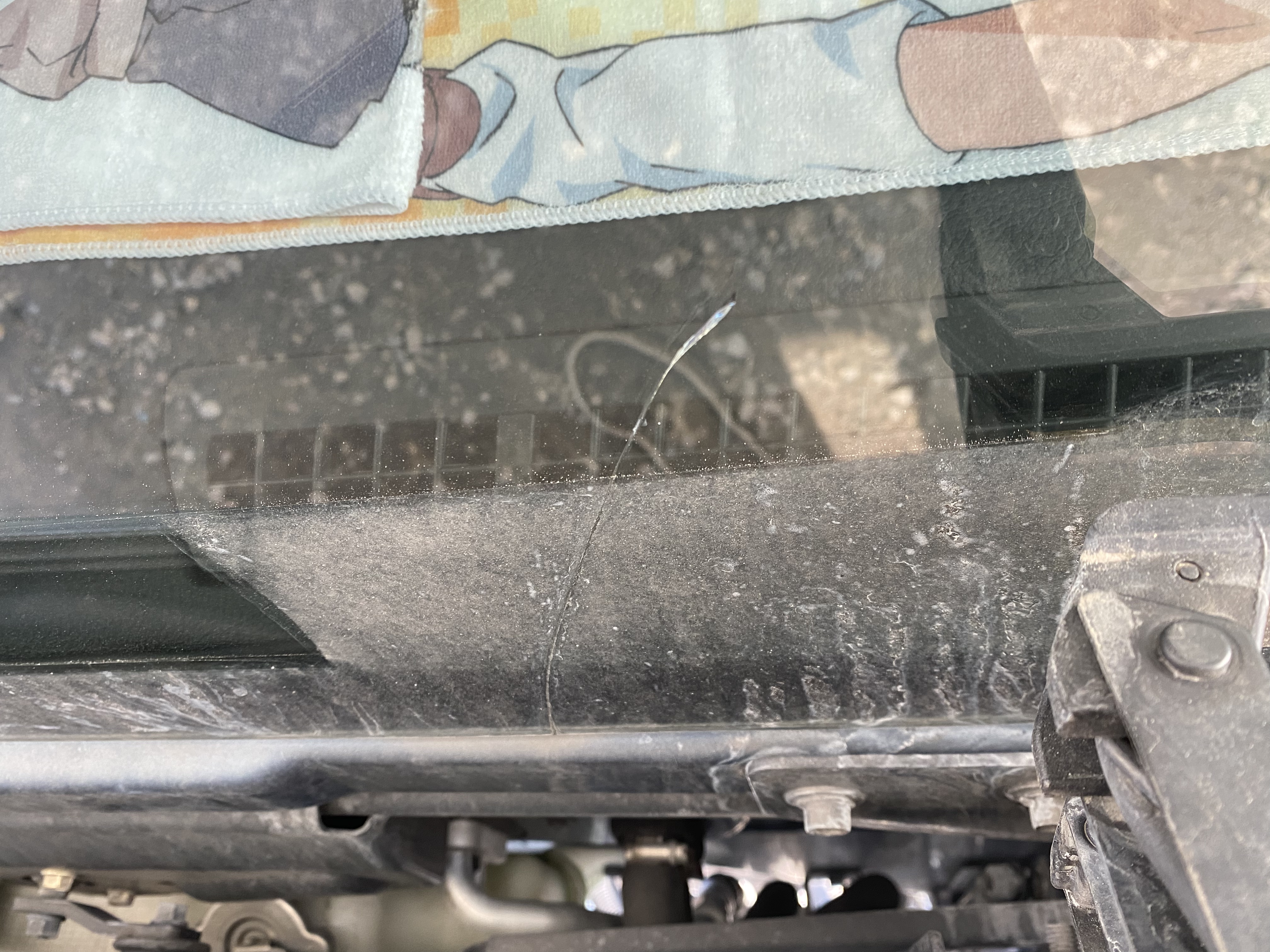 족히 10cm 가까이 금이 간 상태네요. 작은 돌빵이면 복원하고 타겠지만, 이건 복원도 어려울겁니다. 해도 티가 많이 날테고요. 근데 보통 돌이 맞았으면 맞은 자리가 보이기 마련인데, 그냥 유리 끝에서부터 금이 올라오는 형태네요. 이유는 알 수 없습니다.