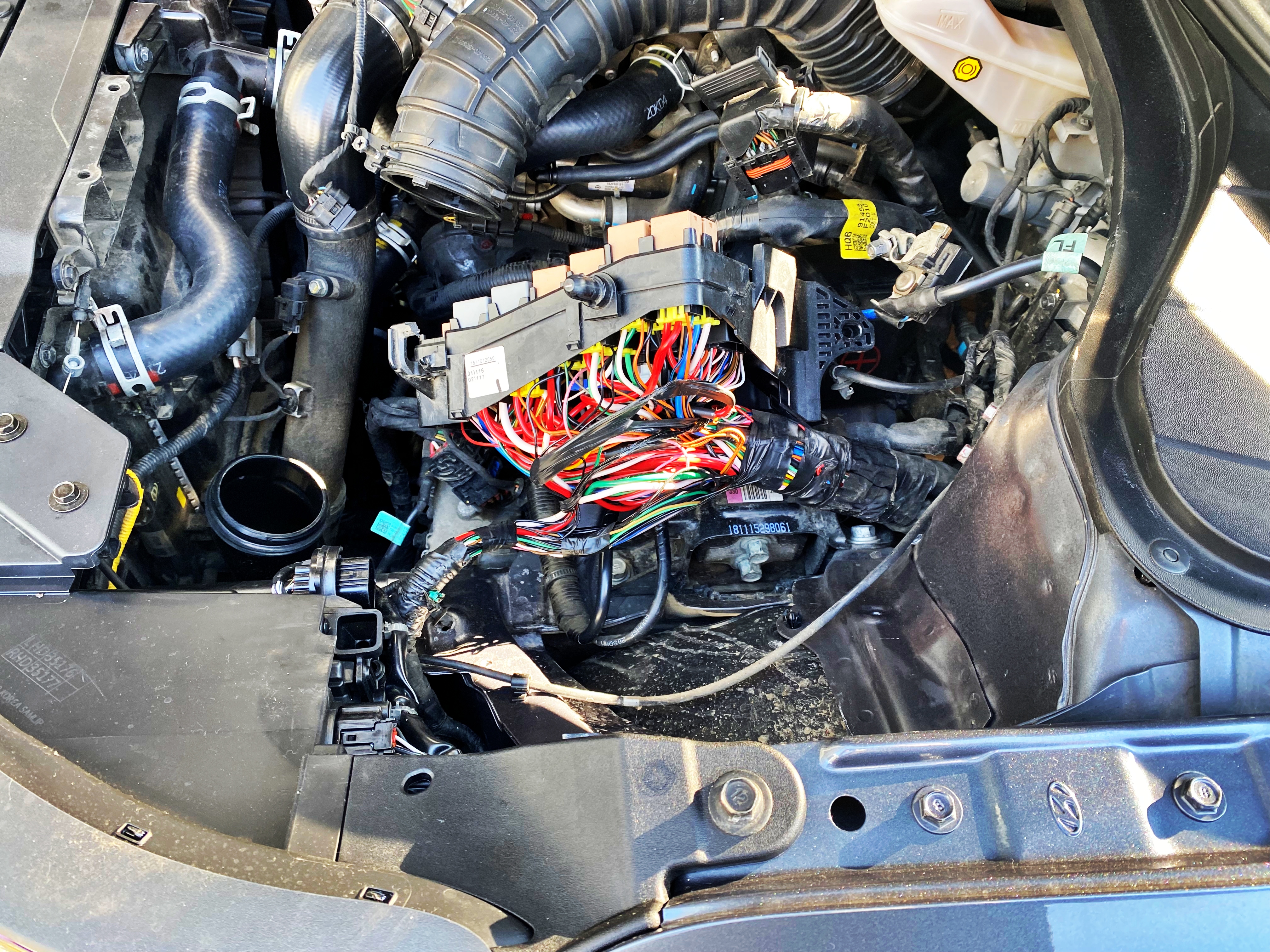 퓨즈박스 생김새와 품번도 똑같습니다. 내내 같은 플랫폼을 사용하는 차량이니 휘발유차와 디젤차라는 차이가 있다고 쳐도 크게 다르지는 않겠죠. 퓨즈박스에서 나가는 배선이 어지럽게 많습니다. 엔진을 내리지 않으면 안쪽으로 지나가는 배선을 걷어내기도 다시 깔아버리기도 힘들겠지요.