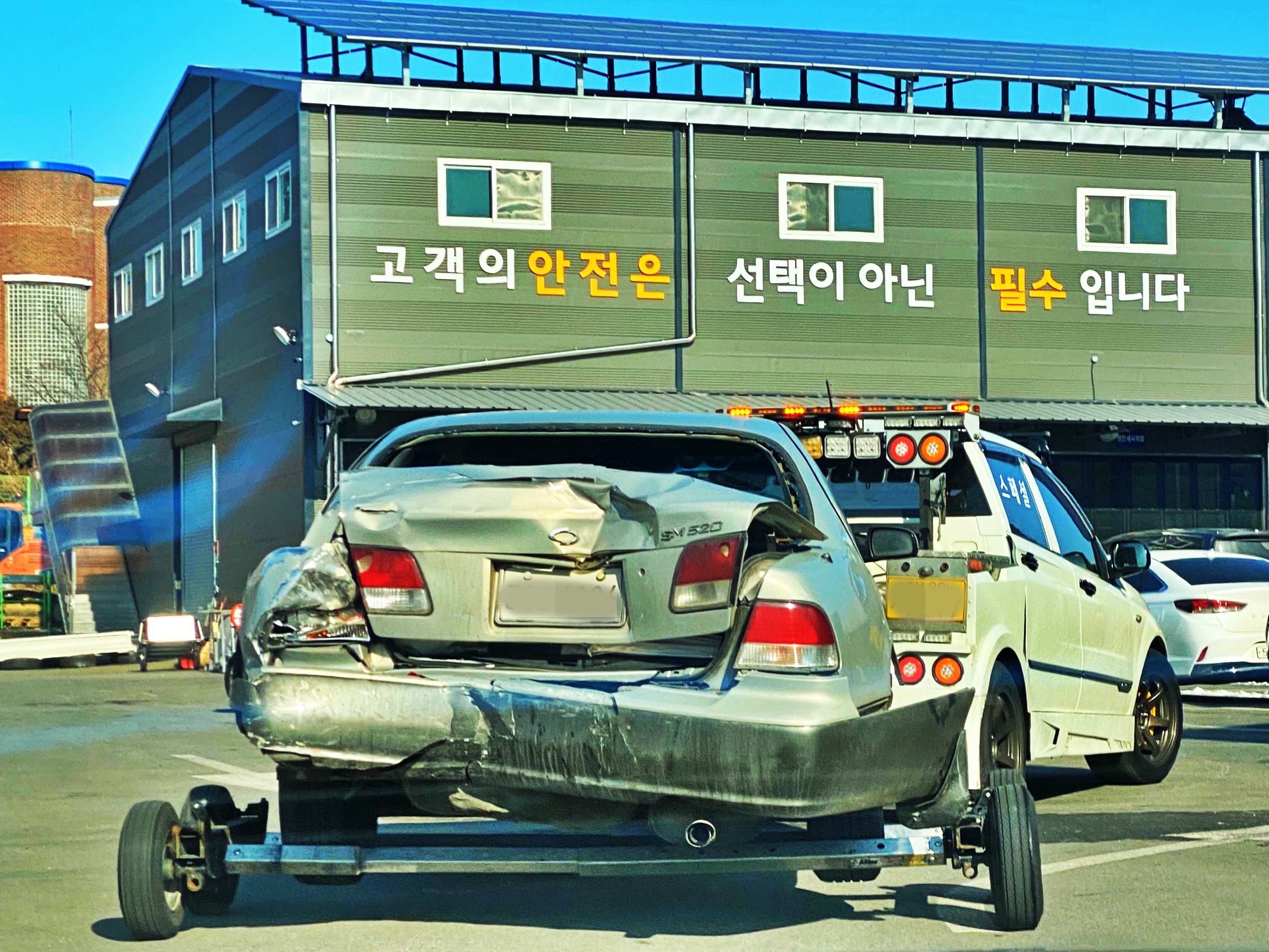 눈물램프 말고 초기형 SM520이 돌리까지 채워진 상태로 공업사에 들어오네요. 20년이 넘은 차량인데 아무리 중고부품을 쓴다고 쳐도 가액이 나올지는 모르겠습니다. 여튼 뭐 가능하니 폐차장이 아닌 공업사로 끌고 왔겠죠.