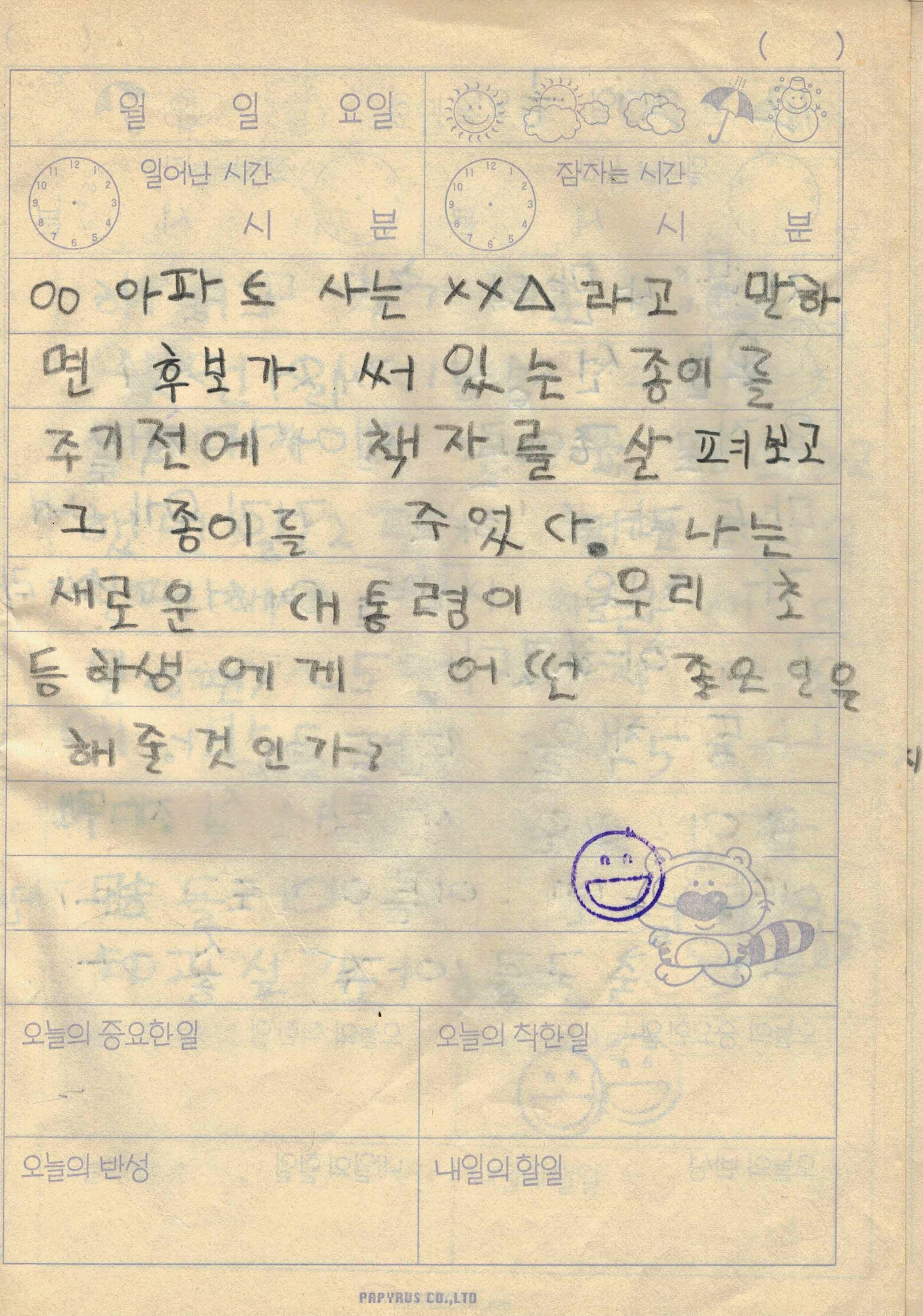 사실 선거 당일에 보고 공개했으면 좋을법한 일기였는데, 오늘 본 김에 올려보려고 합니다. 2002년 12월 19일. 제16대 대통령 선거 당일 집에서 놀다가 투표를 하러 가는 부모님을 따라 투표소에 갔던 이야기를 다루고 있습니다.