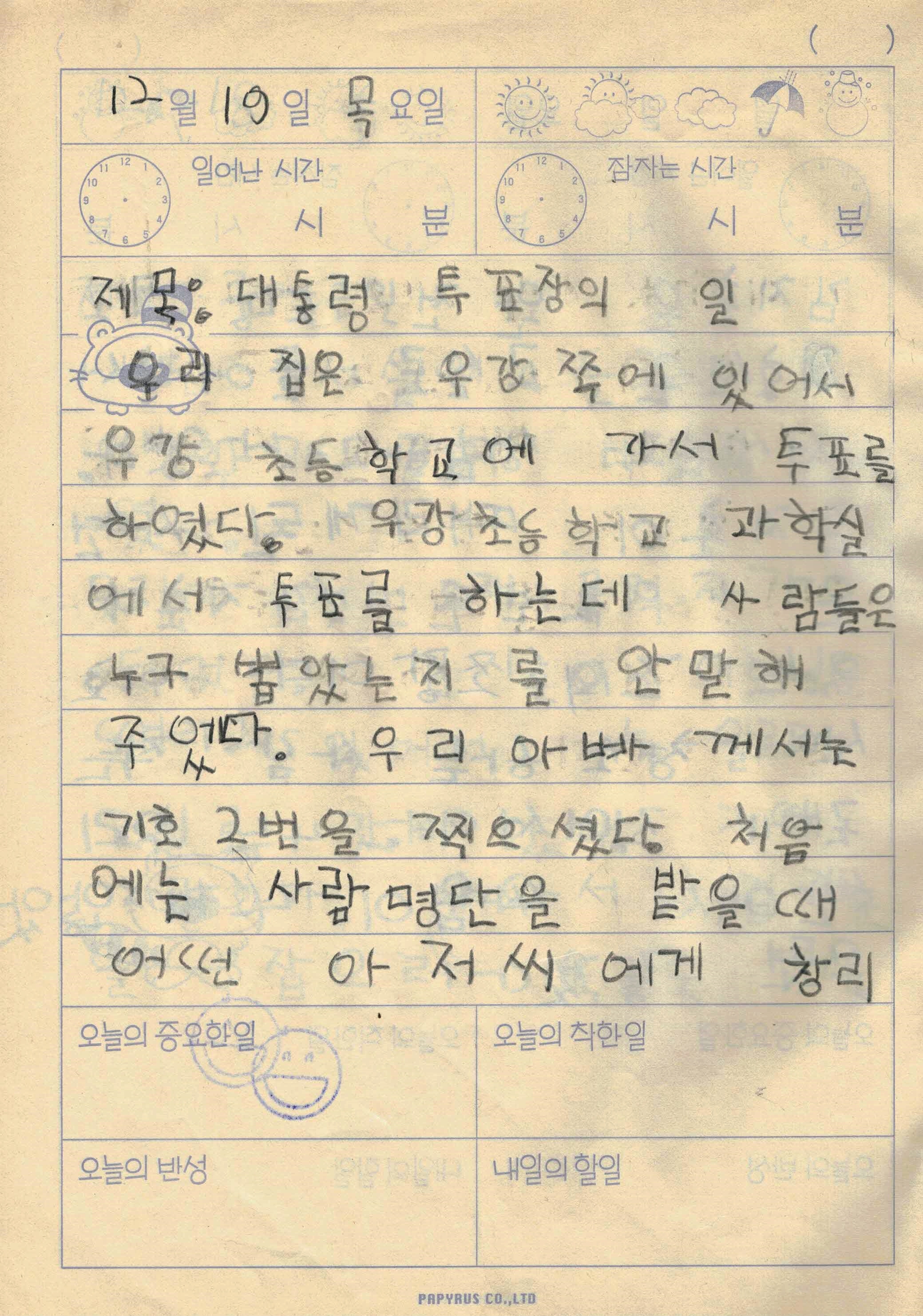 당시 당선되었던 노무현 前 대통령께서 당선되었죠. 여튼 20년 만에 다시 돌아온 대통령 선거를 앞두고 바로 눈에 띄는 일기가 있어 가져왔습니다. 보통 일기는 한쪽에만 쓰고 마는데 무려 두쪽이나 됩니다.