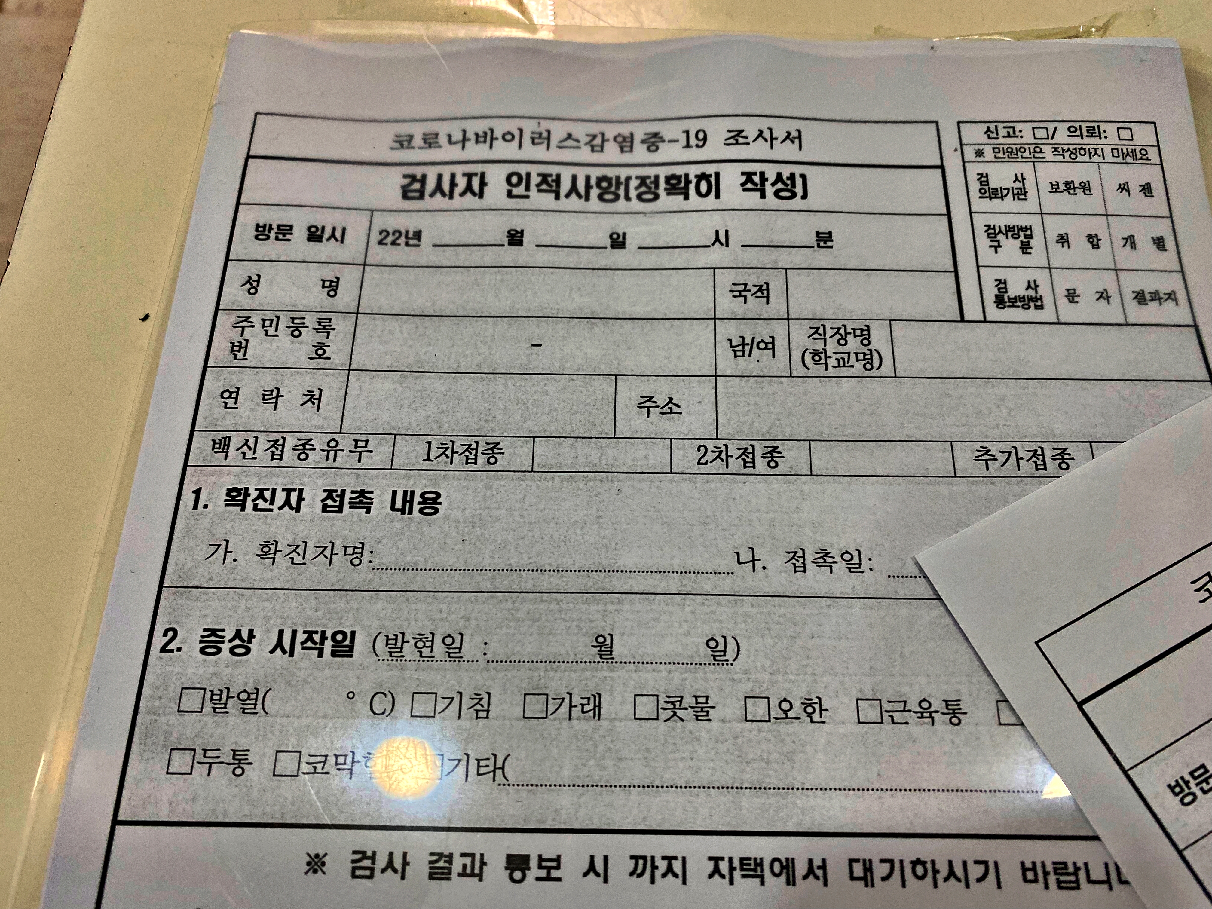 조사서를 작성하고 PCR 검사를 받았습니다.