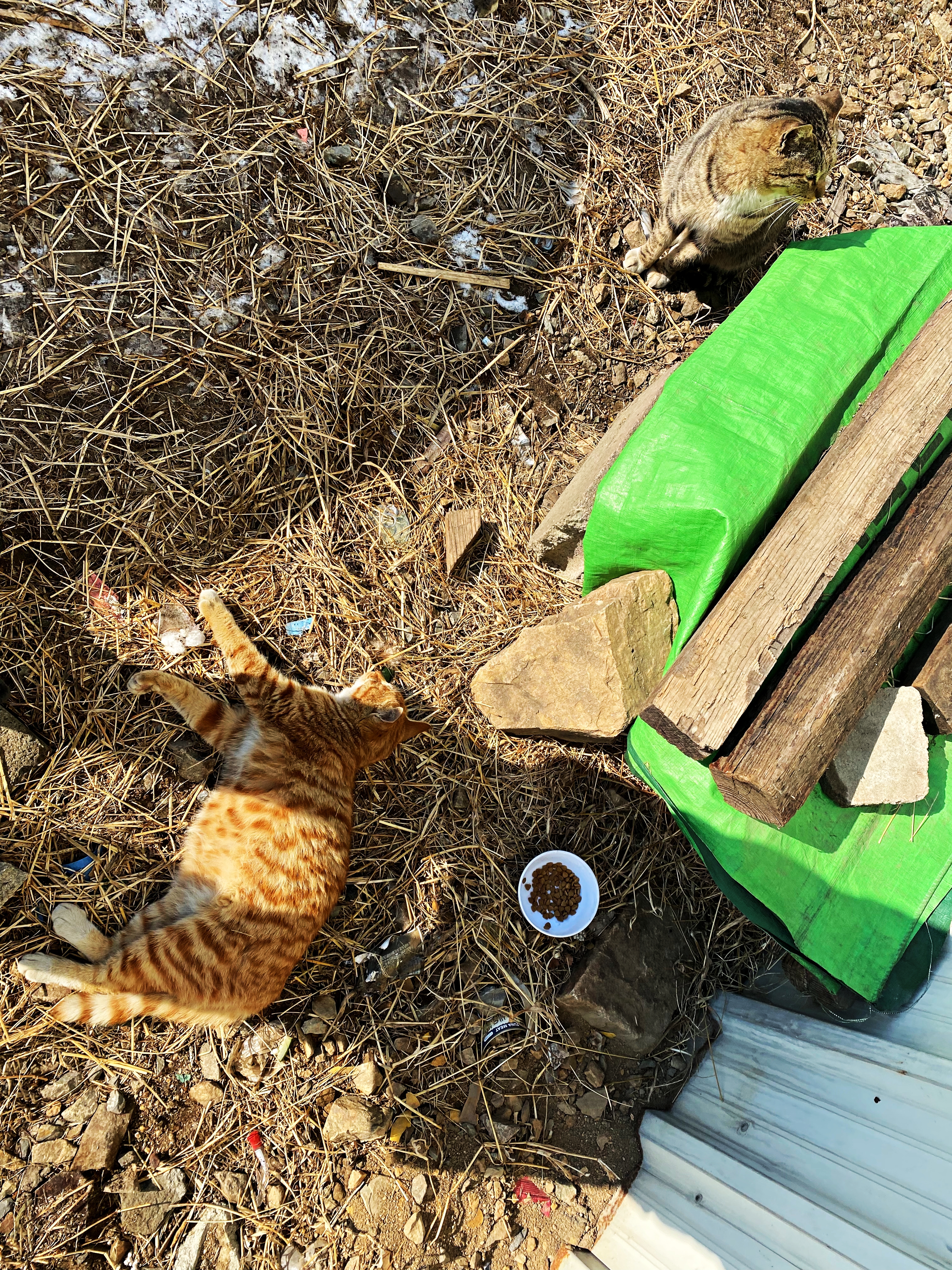 우리 고양이도 꽤나 살이 붙었고 크기도 많이 커졌지만 아직까지 자기보다 엄청 더 큰 고양이들에게 당하고 사는 입장으로 보입니다. 저는 보란듯이 사료를 더 가져다 주고 물도 주고 츄르도 줬습니다. 꼬우면 니들도 괴롭히지 말라는 행동이라 보면 되겠죠.