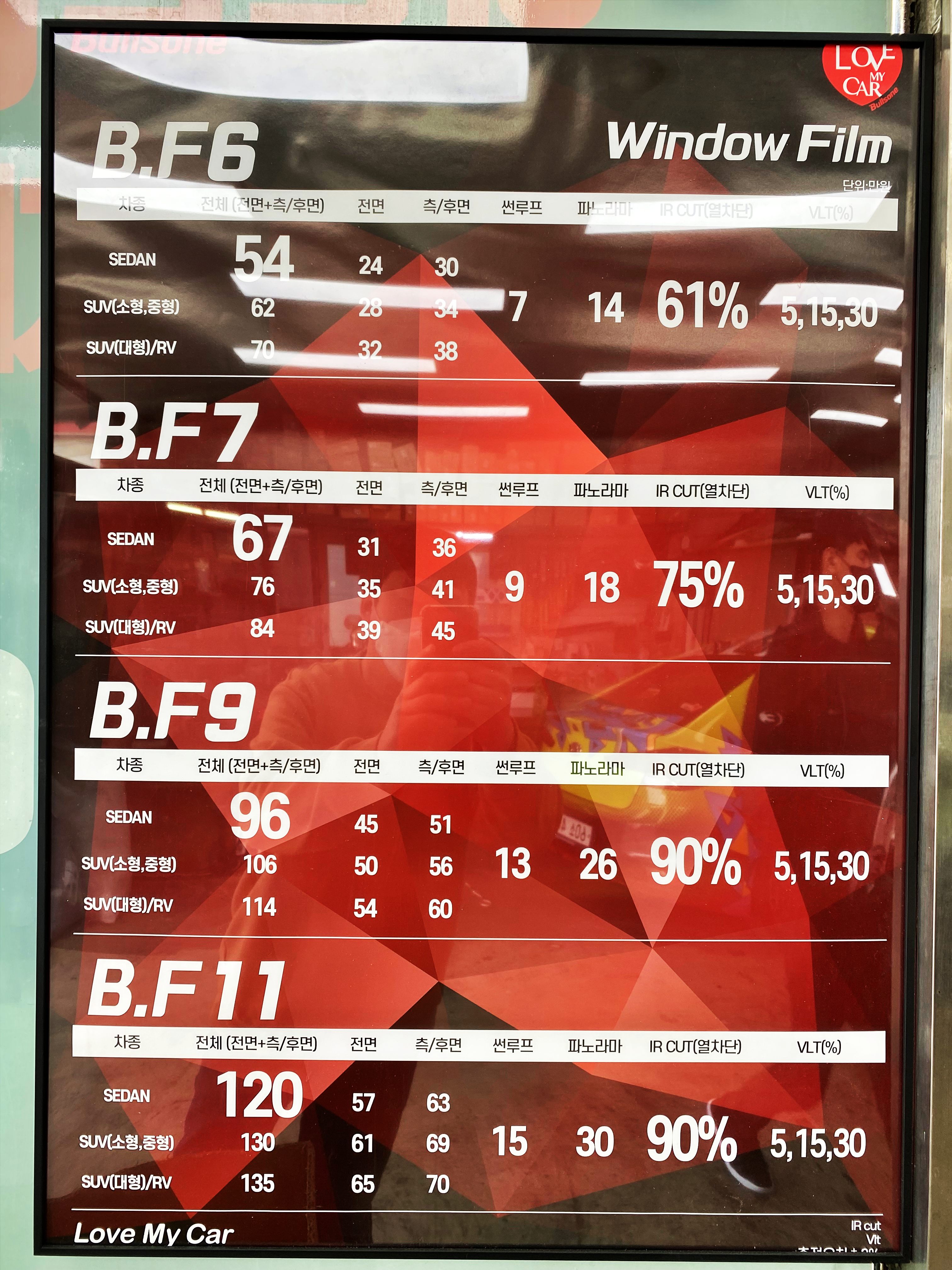 고민 끝에 금속성 반사필름 대신 일반 필름인 B.F 9를 선택했고, 농도는 국민 농도인 전면 30%. 측후면 15%로 결정했습니다.