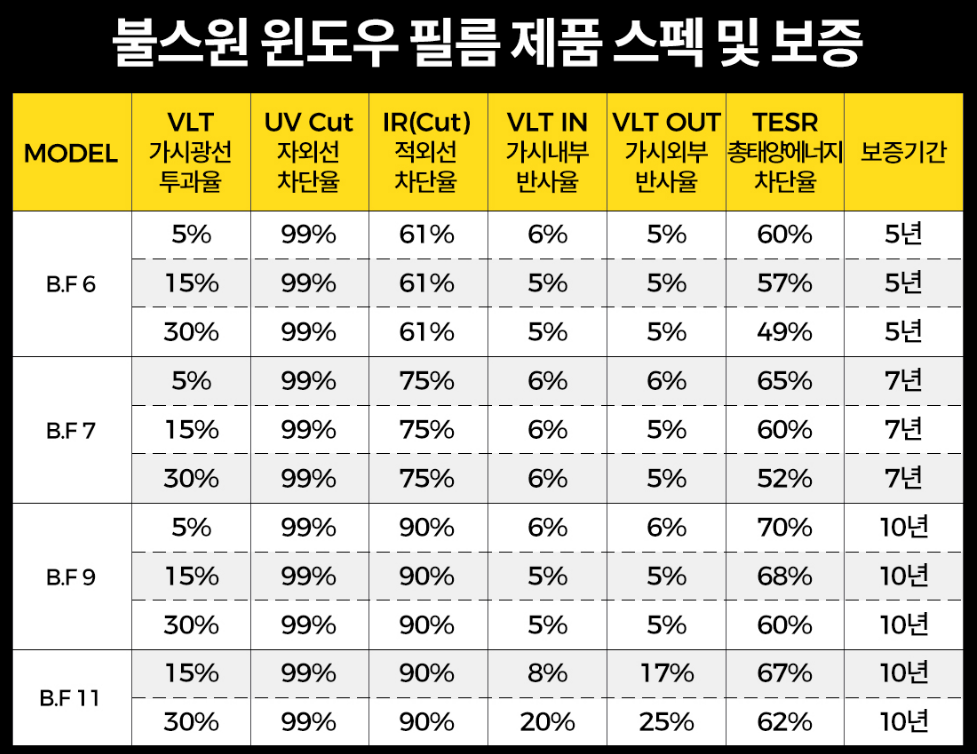 위 표에서 가장 중요하게 살펴볼 것은 TESR(총 태양에너지 차단율)인데, 가시광선 투과율(농도)이 높으면서도 TESR이 높은 필름이 성능이 뛰어난 제품입니다. 특히 B.F 9와 B.F 11 필름의 경우 하이엔드급 스펙으로, 다른 브랜드의 플래그십 필름과 비슷한 성능을 보여주고 있습니다.