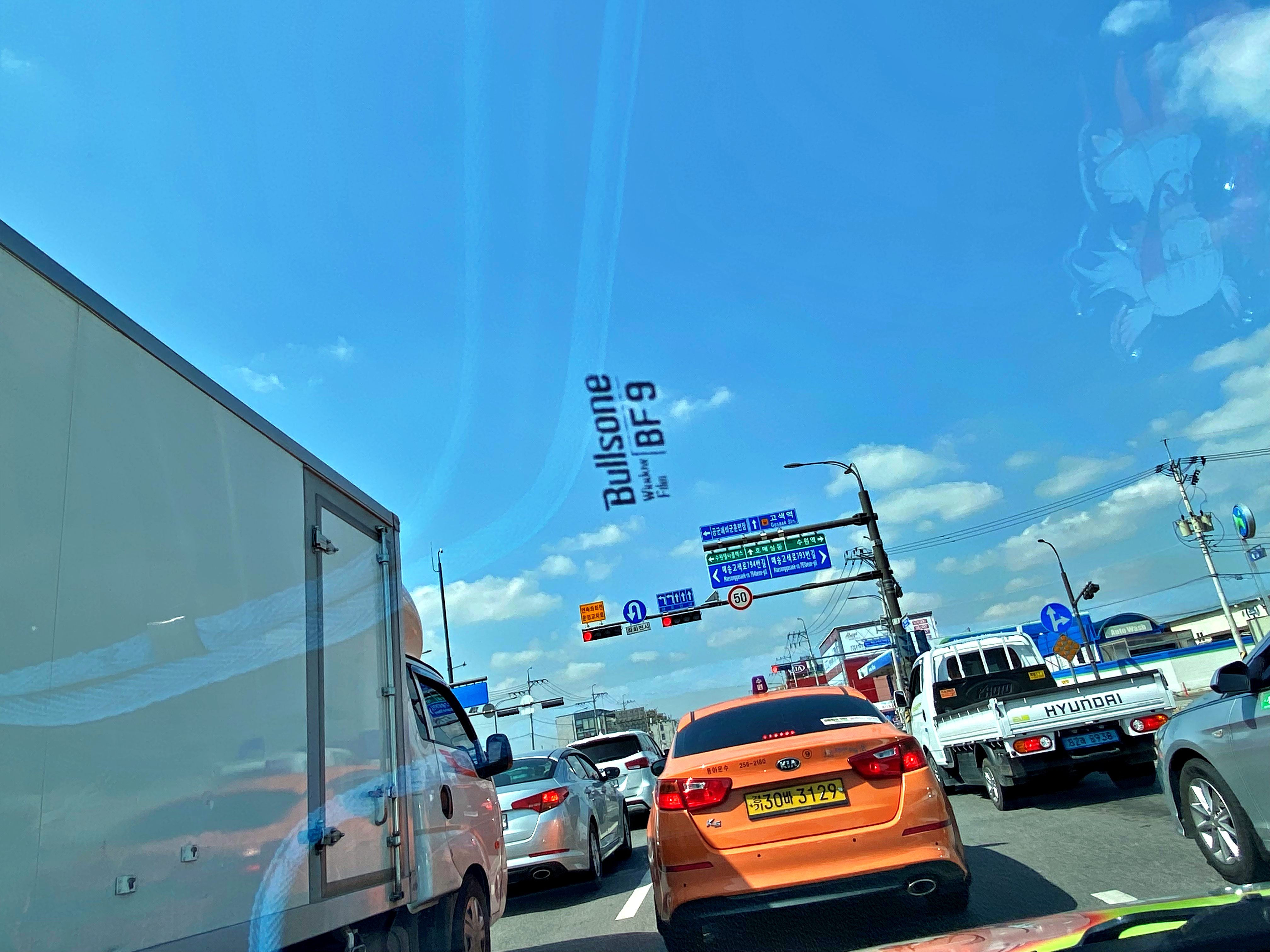 다른 필름이 아닙니다. 불.스.원 필름을 시공했다는 사실을 차량 내부에서도 느낄 수 있습니다. 이 로고가 거슬린다면 물파스로 살짝 문질러주면 지워집니다. 크게 거슬리지는 않으니 불스원 뽕에도 좀 취해볼 겸 일단 그대로 다닙시다.