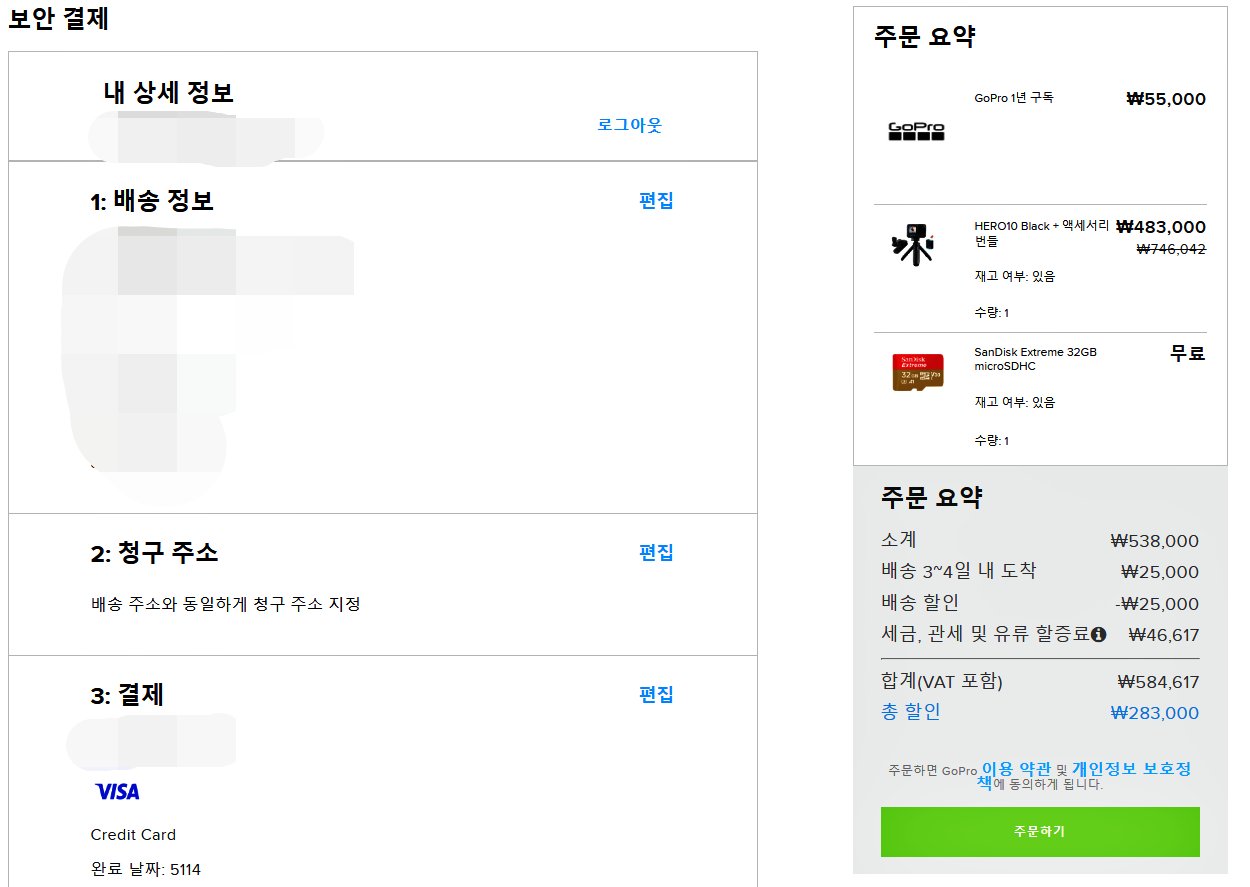 예전부터 액션캠이 가지고 싶다는 생각만 했지 직접 구매하려 마음먹기는 처음입니다. A/S가 상대적으로 용이한 국내 총판에서 구입할지 연간 5만 5천원인 고프로 구독을 이용하면 큰폭으로 할인해주는 미국 본사 홈페이지에서 구입할지 고민했는데, 고민 끝에 미국 본사 홈페이지에서 액세서리 번들킷으로 구매하려 했으나 결제가 되지 않네요.