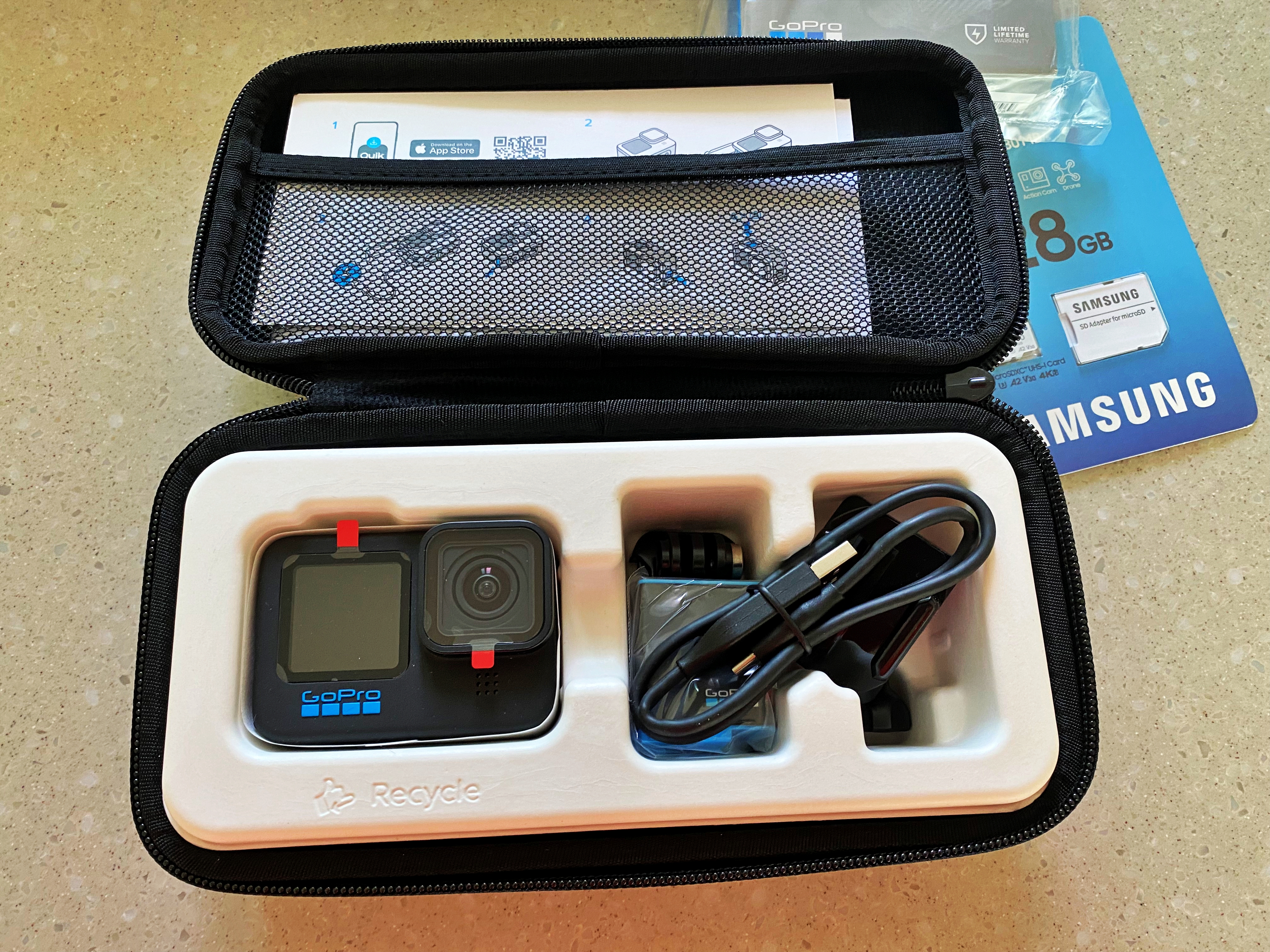 고프로 히어로 10 블랙 본체와 엔듀로 배터리 128GB 메모리카드가 전부입니다.