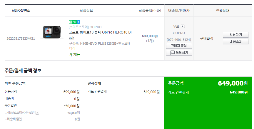 고프로 히어로10 블랙 단품과 128GB 메모리카드. 정품 배터리 구성의 가격입니다.