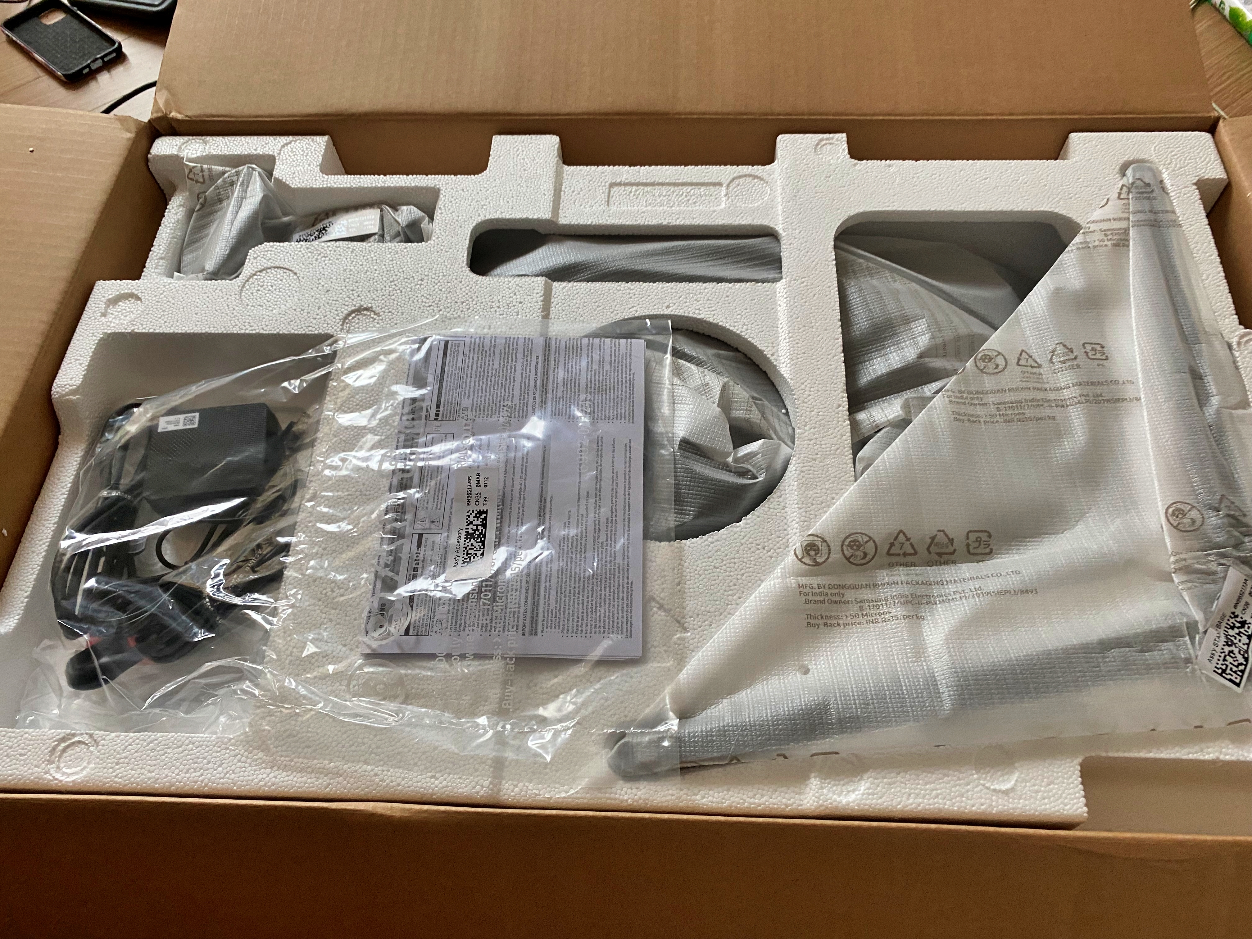 19V 전원 아답타와 설명서, 그리고 모니터 스탠드가 자리잡고 있네요. 설명서를 보고 모니터를 조립하여 책상 위에 올려두기로 합니다.