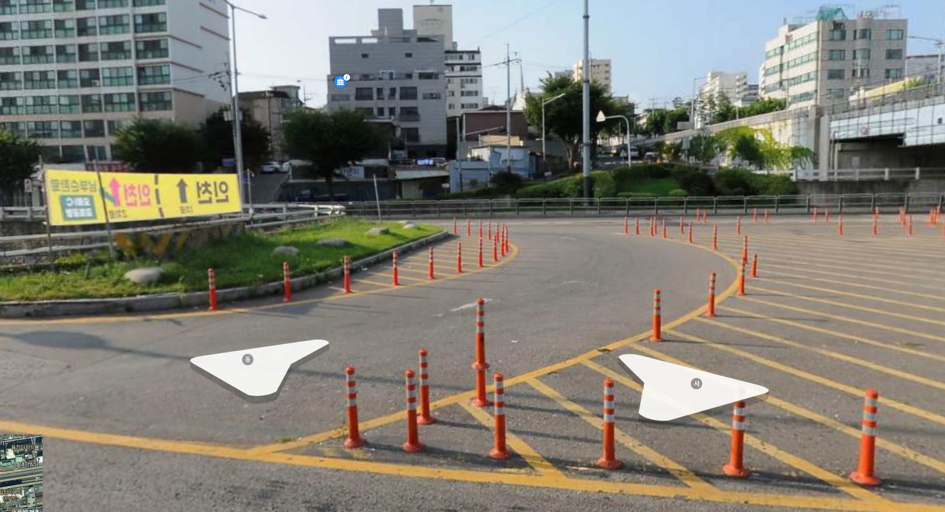 지난해 8월 로드뷰인데, 저 멀리 반대편 차선쪽에 보시면 화곡고가 교각이 있는 자리를 안전지대로 표시해두고 차단봉을 박아놨는데, 이 차단봉을 지금은 회전하여 돌아 나오는 앞까지 박아놨습니다. 좀 더 안쪽으로 꺾어서 돌면 되지 않겠냐 하실텐데, 안쪽으로는 돌아 나오자마자 지하차도와 붙어있는 공사 문제로 차선을 차단해놨습니다. 반대편 로드뷰를 보여드릴게요.