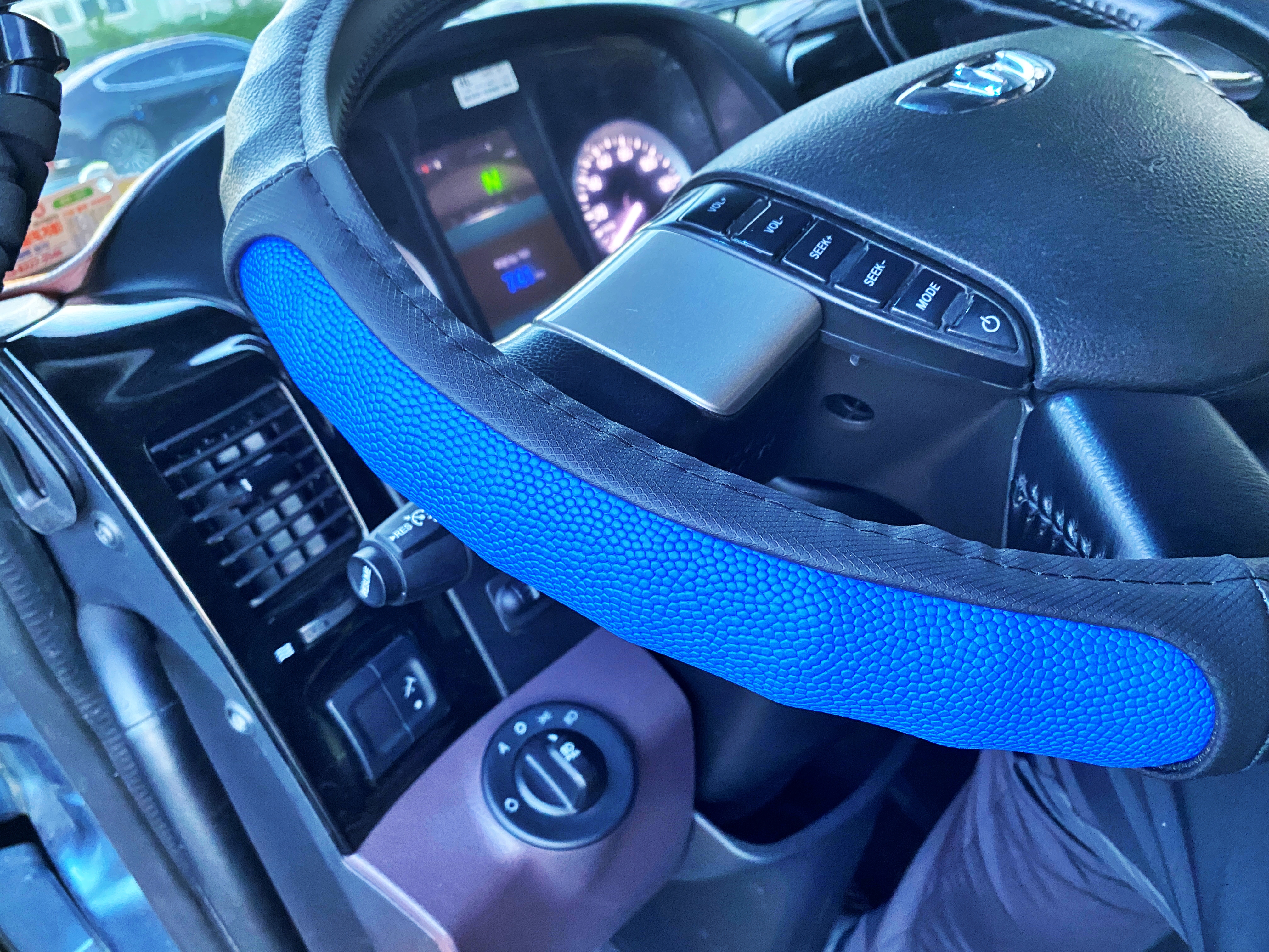 그립감은 그럭저럭 괜찮네요. 다만 핸들을 돌리니 손에도 특유의 고무냄새가 묻어나옵니다. 핸들커버도 수차례 닦고 여러번 환기도 시켰으나 그래도 냄새가 납니다. 뭐 중국제가 다 그렇죠. 비슷한 제품을 구매하셨다면 꼭 며칠은 밖에 둬서 냄새를 빼고 잘 닦은 다음 장착하시기를 추천드립니다.