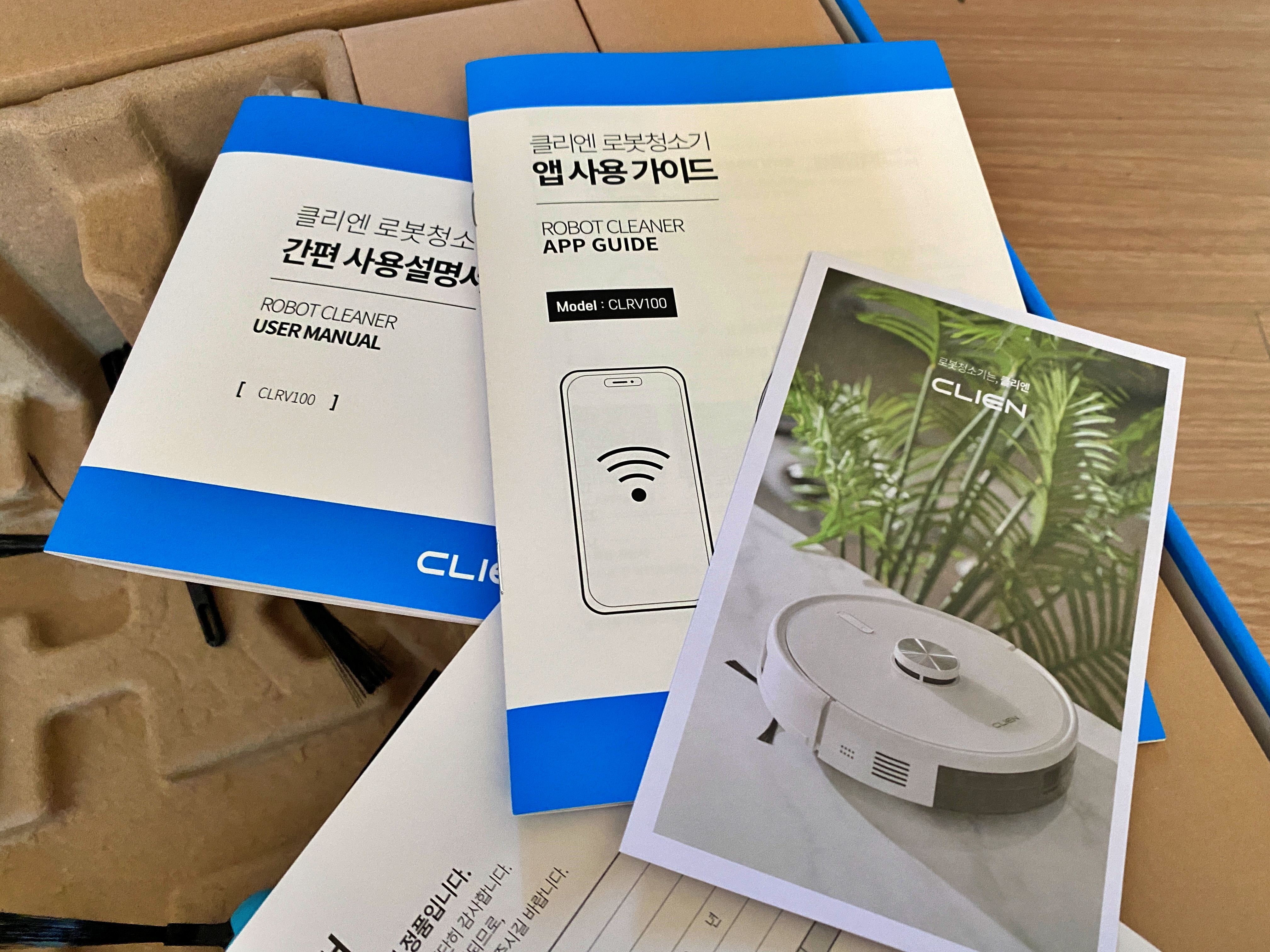로봇청소기의 간편 사용설명서와 앱 사용 가이드가 들어있습니다.