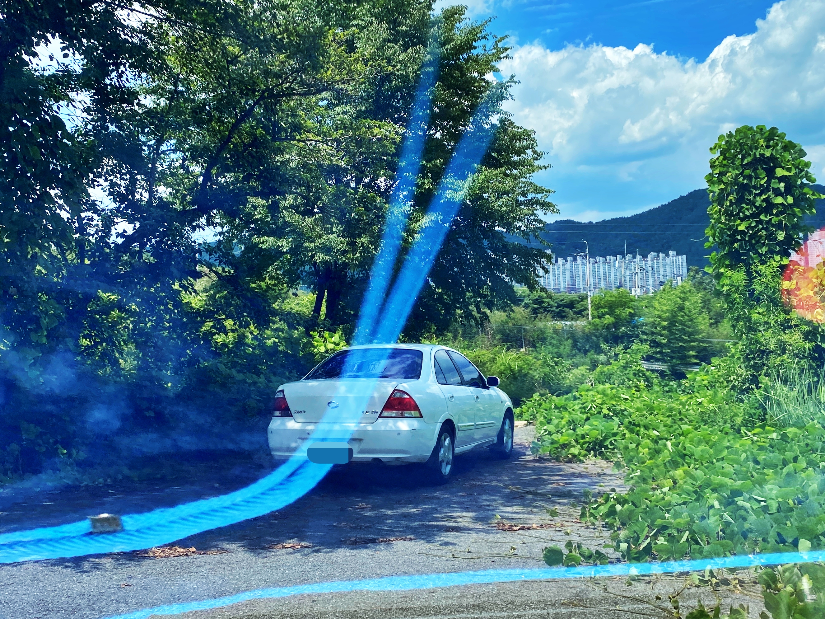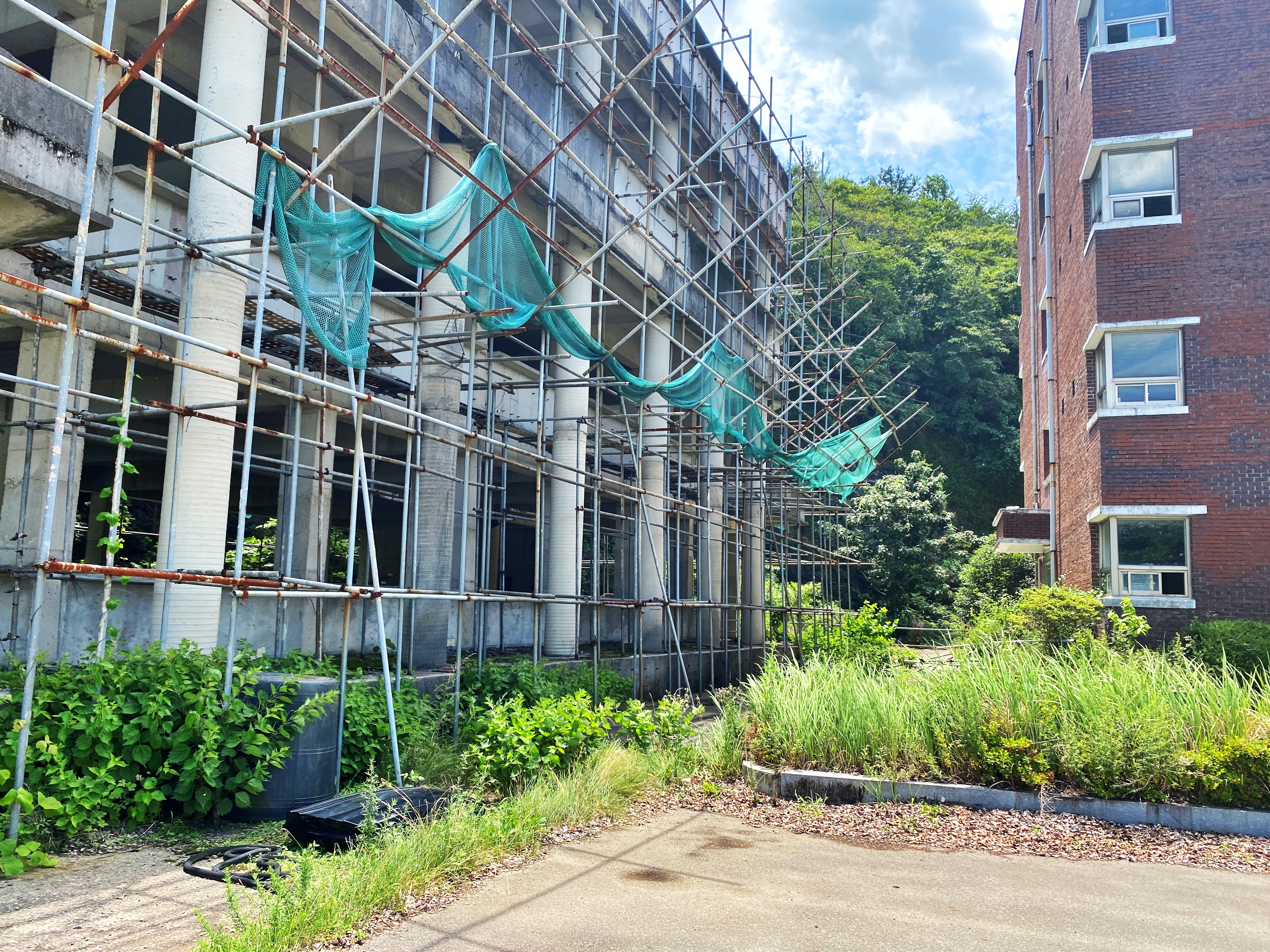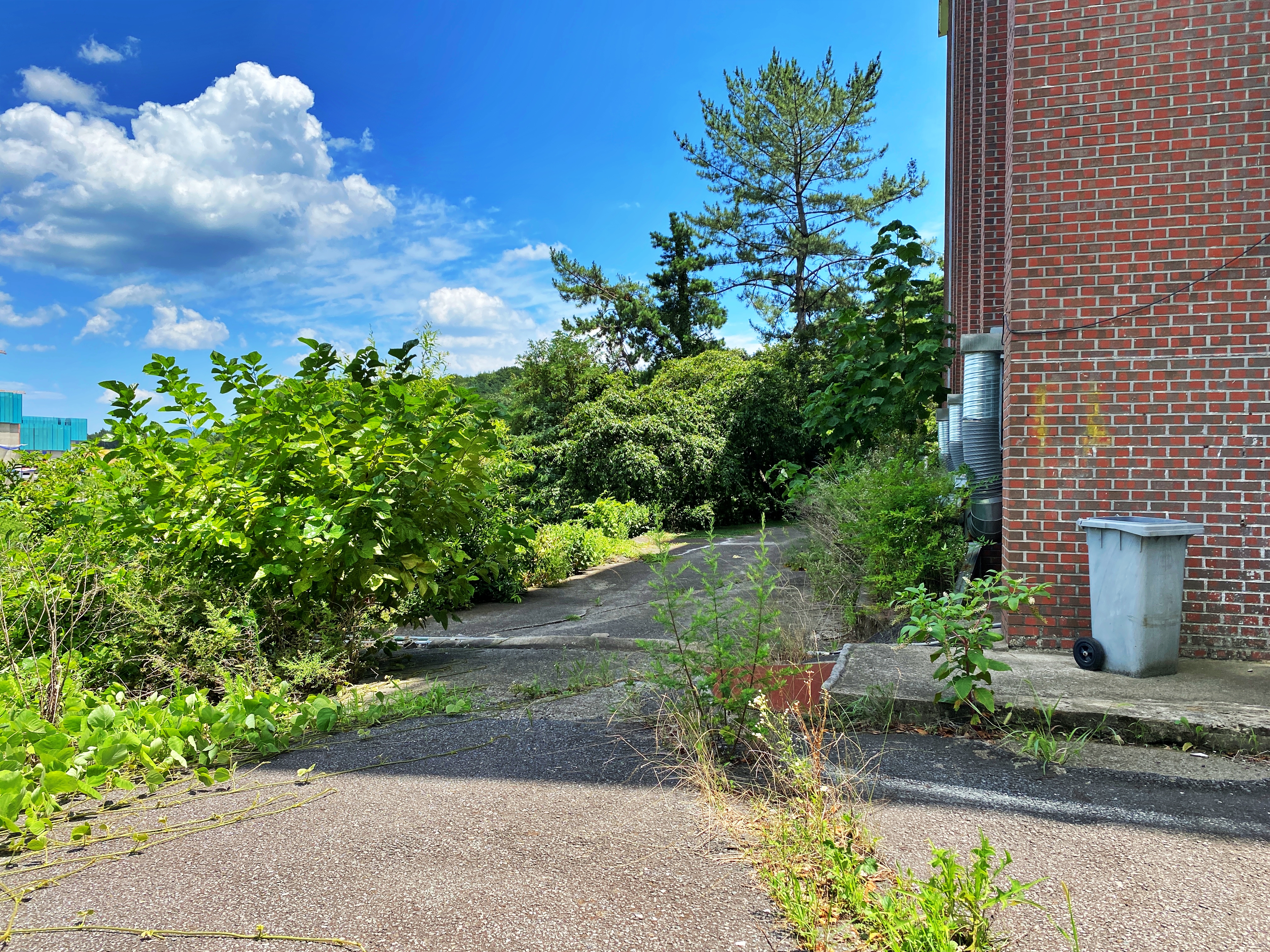 학기 중에도 기숙사는 운영되지 않은 듯 보입니다. 왕복 2차선 도로의 절반을 수풀이 잡어삼켰습니다.