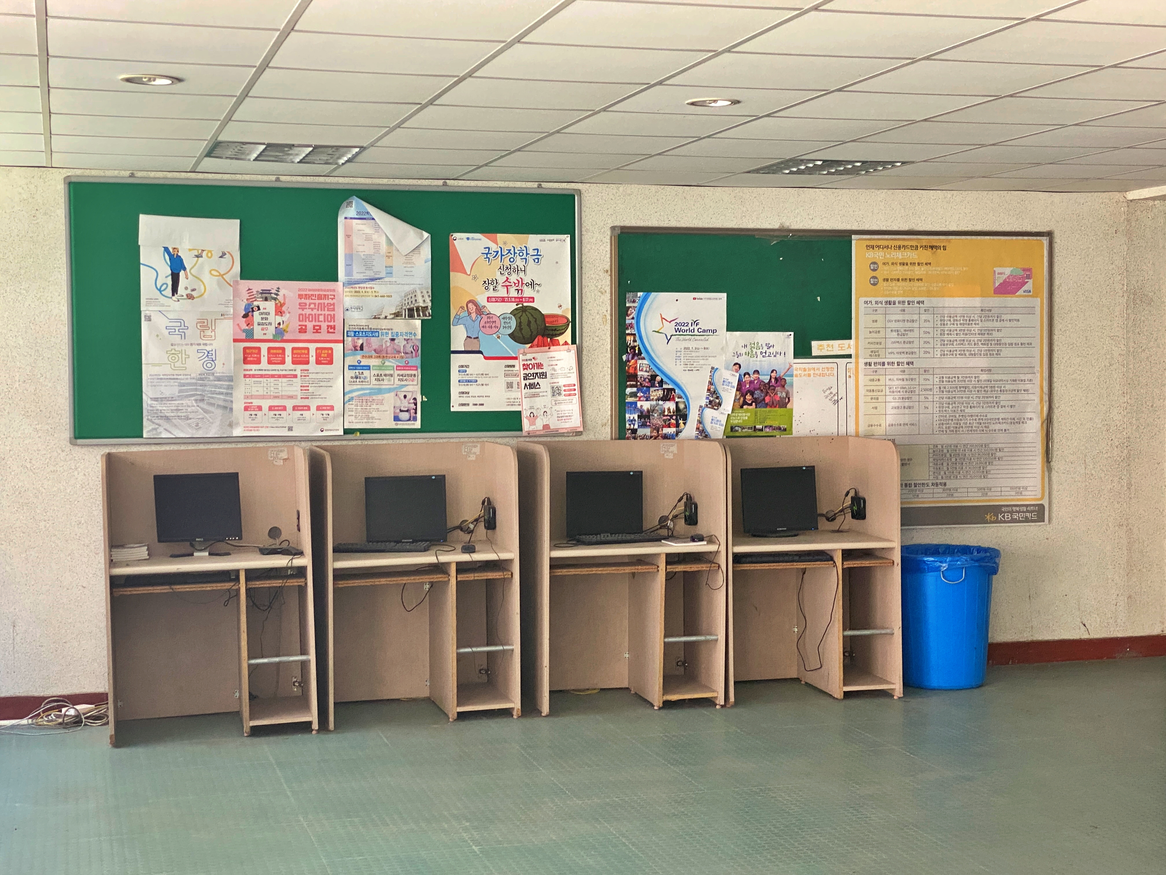 모니터도 10년 전에도 퇴물 취급받았던 4:3 비율의 17인치 모니터입니다. 아마 스마트폰이 완전히 보급되기 전 그 시절에 사용하던 시설이 그대로 남아있는 게 아닌가 생각됩니다. 최소 스마트폰이 보급되며 컴퓨터로 할 수 있는 다수의 업무를 핸드폰으로 할 수 있게 되었으니 말이죠. 프린트 같은 PC로 해야 하는 업무나 스마트폰 대비 훨씬 더 큰 화면과 UI로 좀 더 편하게 처리한다는 장점이 있습니다만, 대부분의 학생들이 컴퓨터로 가십거리나 즐겼을테니 아마 스마트폰 보급 이후로는 외면받았을겁니다. 요즘은 게임용이 아니곤 집에 개인용 PC 하나 없는 경우도 많으니 말입니다.