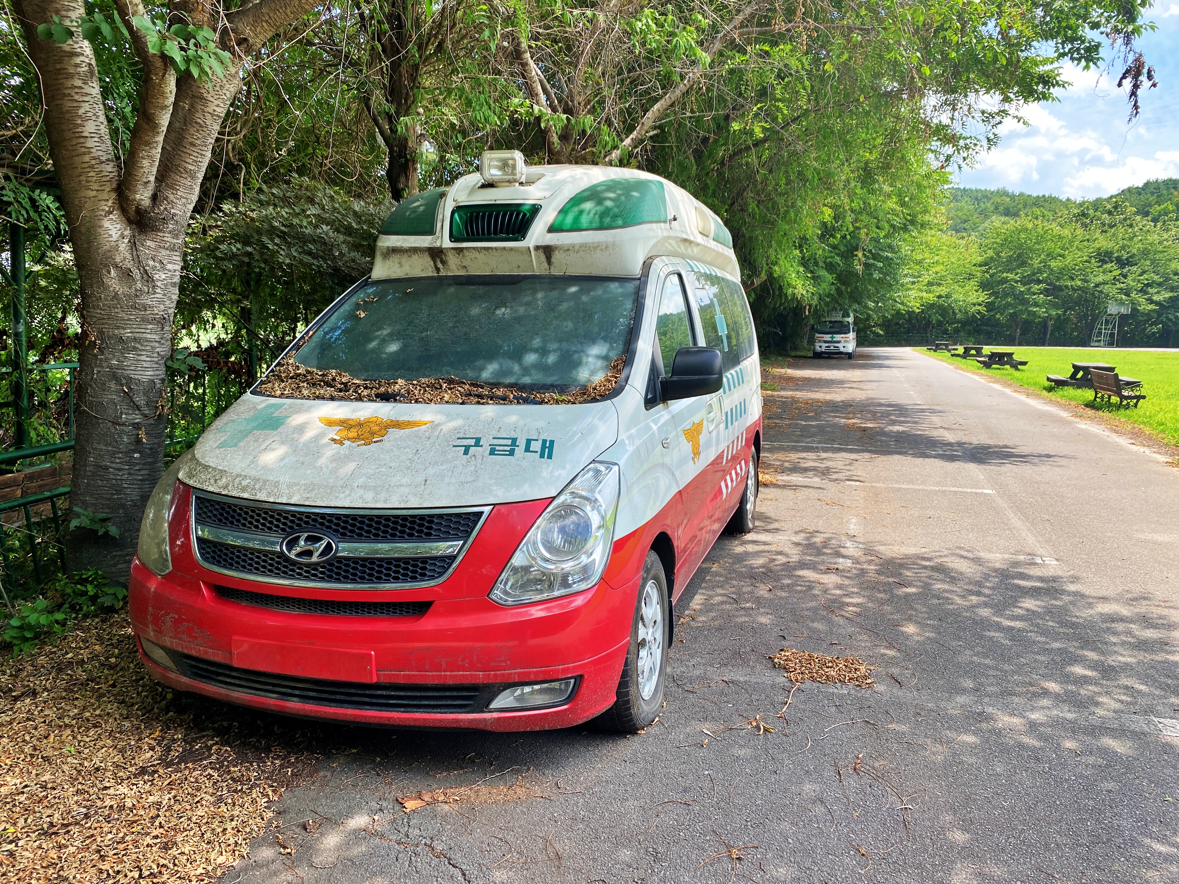 등나무 쉼터를 거쳐 구석에 주차된 구급차들을 구경하기로 합시다.