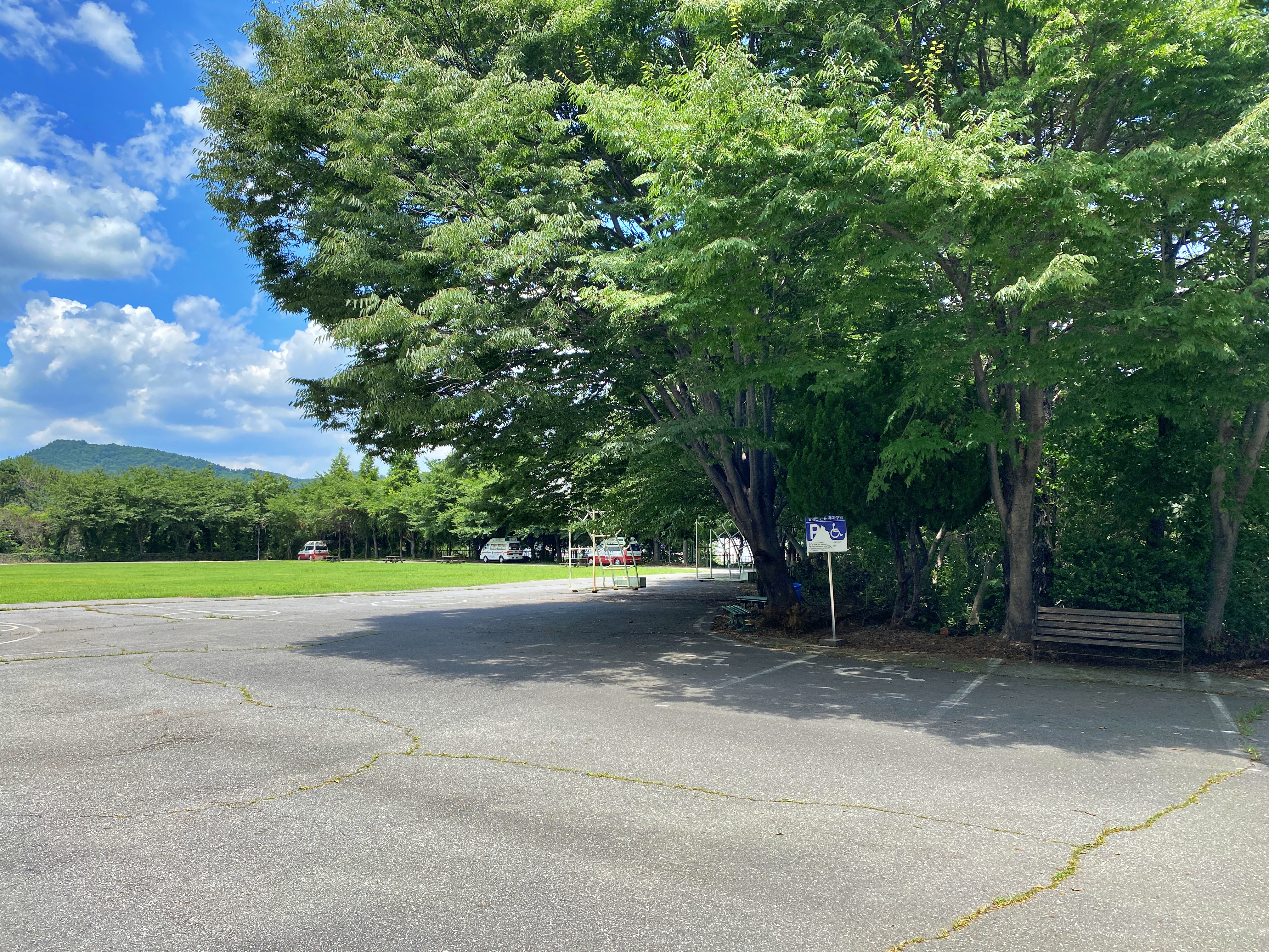 드넓은 잔디밭 주변으로 아름드리 나무들이 감싸고 있습니다. 아마 넓은 잔디밭은 축구장을 목적으로 깔아 두지 않았나 싶습니다만, 농구 골대만 보이지 축구 골대는 볼 수 없습니다. 그래서 축구 골대는 어디에 갔는지 찾다 보니 울타리 뒤에서 나오는군요.