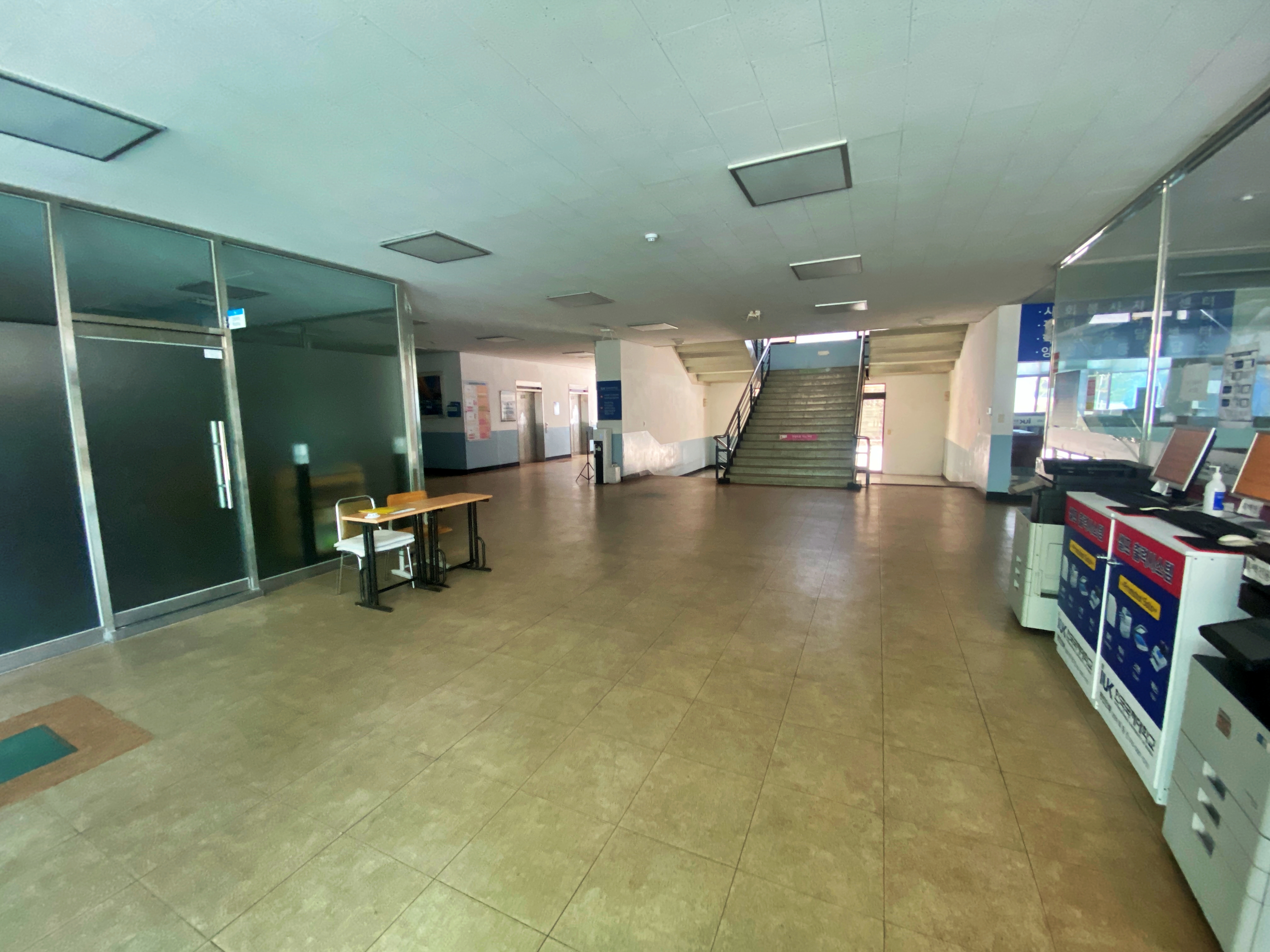 중앙 계단과 좌측 끝에는 엘리베이터도 2기가 가동 중이고 학생들을 위한 정수기와 같은 시설도 보입니다. 그렇게 보건복지관을 나와 맞은편 언덕에 있는 수송공학관으로 향합니다.