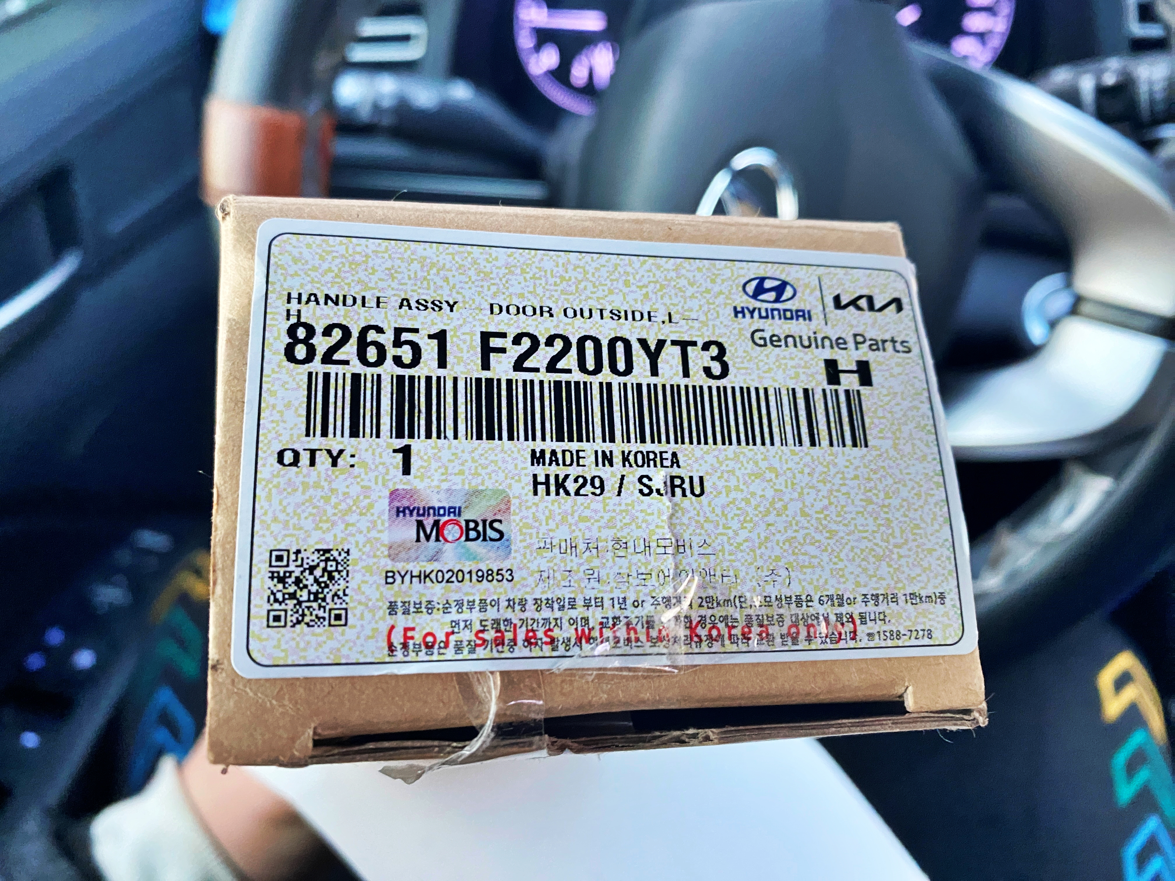 한국에서만 판매할 수 있다는 문구가 작게 들어가 있네요. 품번의 끝 세 자리는 차량의 색상 코드를 의미합니다. 자신이 타는 차량의 컬러코드를 알고 있다면 쉽게 구할 수 있지요. 여튼 이 물건은 삼보에이앤티라는 회사에서 제조한 물건입니다.