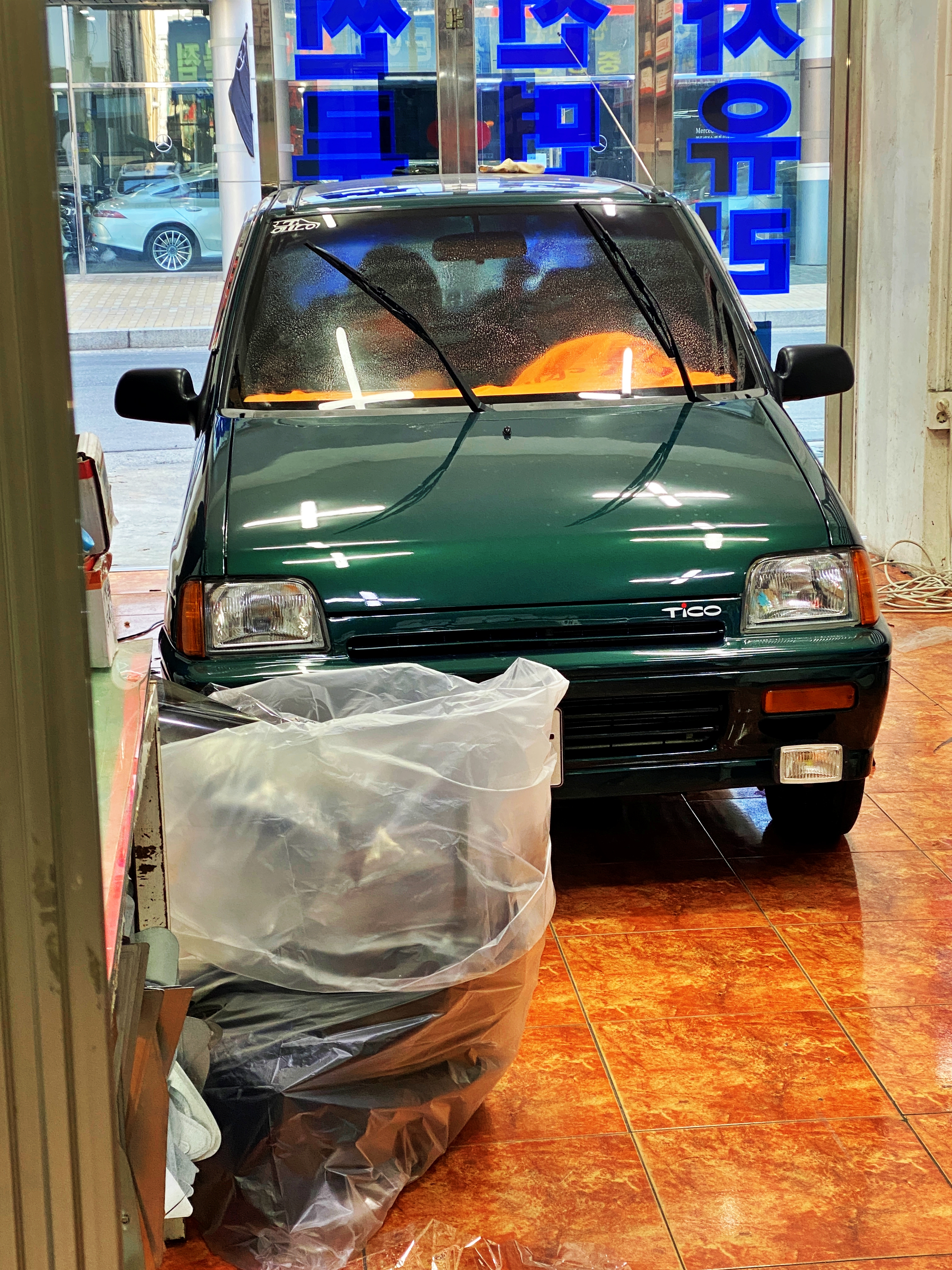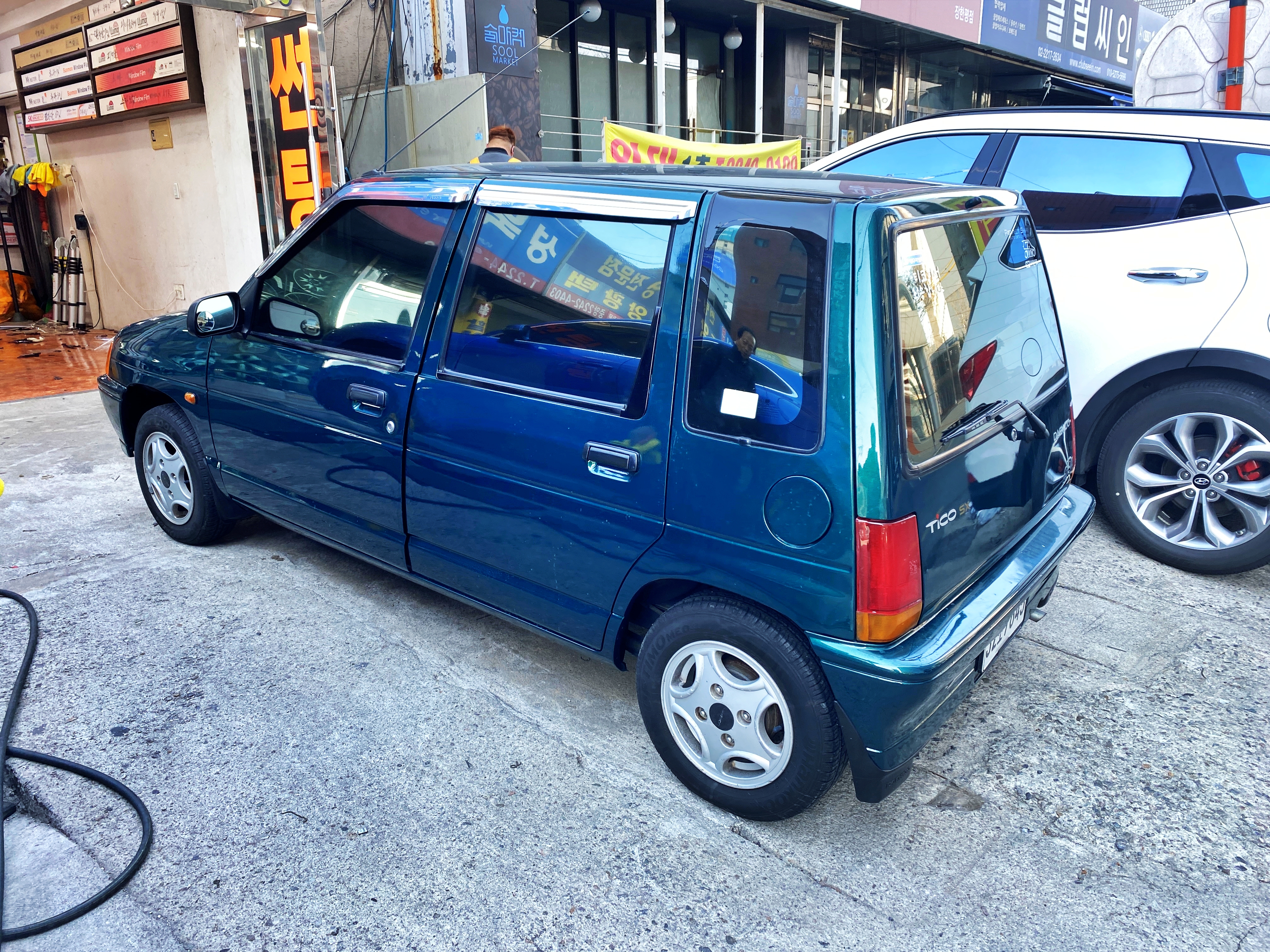 작업장에서 밖으로 나올 준비를 하고 있습니다. 그냥 이렇게 봐도 녹색 티코에 녹색빛 나는 유리창이 상당히 잘 어울립니다.