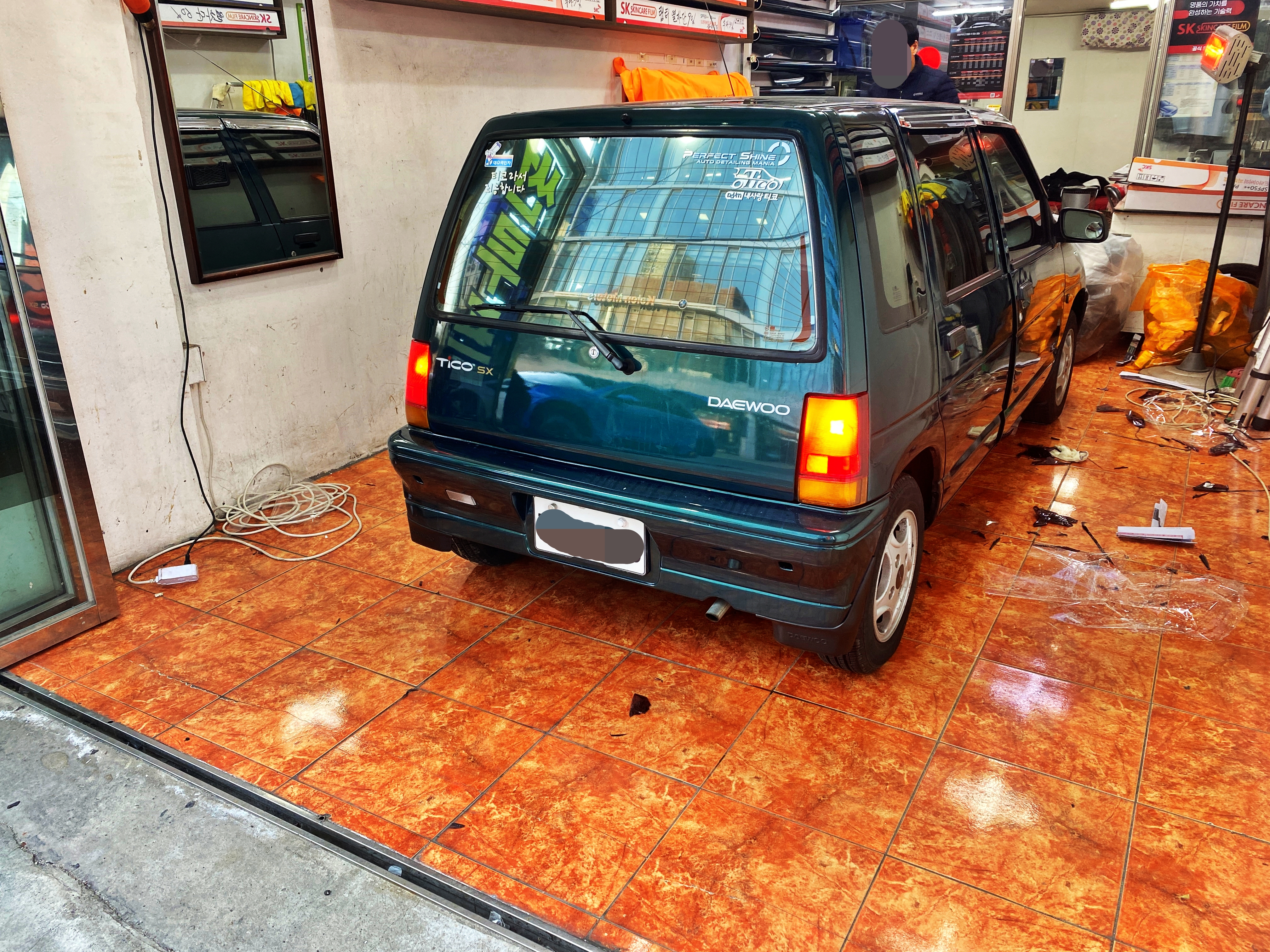 기존 필름 제거를 포함하여 소요시간은 약 3시간 정도 걸린다고 합니다. 가장 최근에 티코가 입고되었던 게 H.O.T 멤버 장우혁이었다고 하네요. 그분이 티코를 매각한 지 벌써 5년 가까이 지난 걸로 기억합니다. 그러고 티코가 또 들어오겠어 싶어 가다(틀)를 버렸는데 이렇게 또 티코가 들어왔다고 하네요.