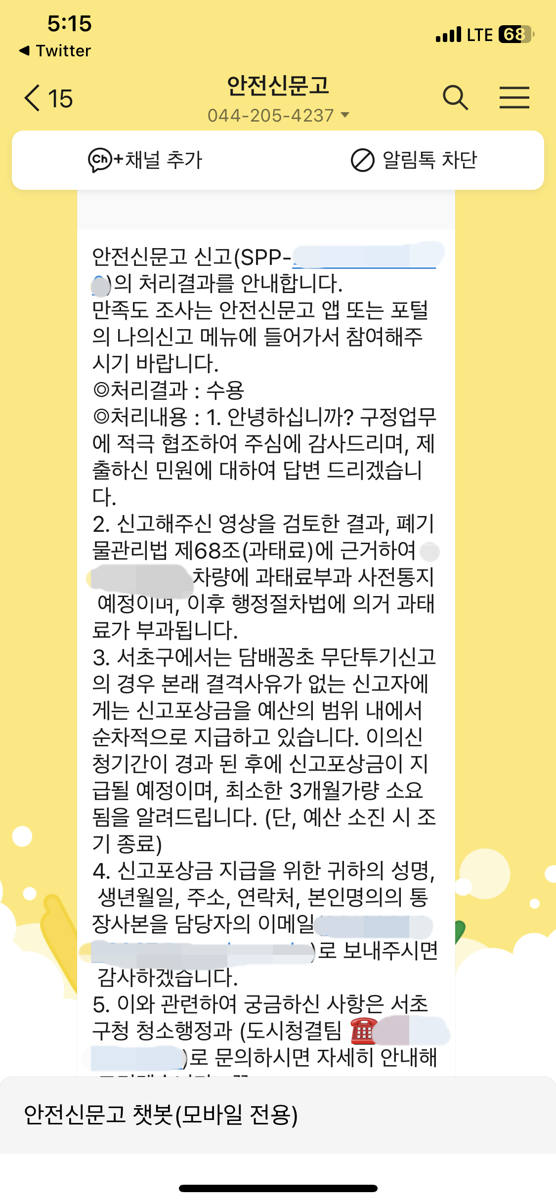 2. 신고해 주신 영상을 검토한 결과, 폐기물관리법 제68조(과태료)에 근거하여 차량에 과태료부과 사전통지 예정이며, 이후 행정절차법에 의거 과태료가 부과됩니다.