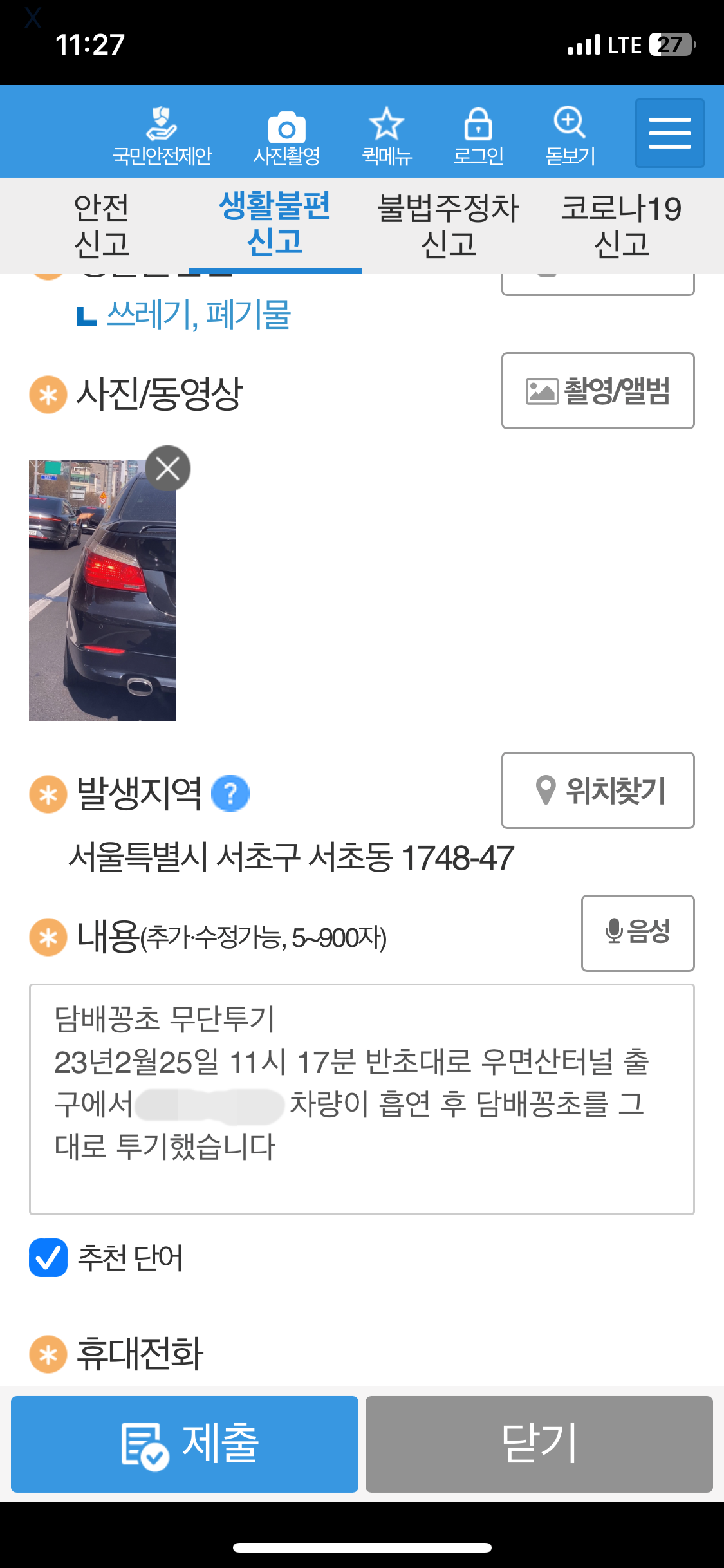 바로 생활불편신고 앱을 켜고 녹화된 영상을 첨부하여 신고했습니다.