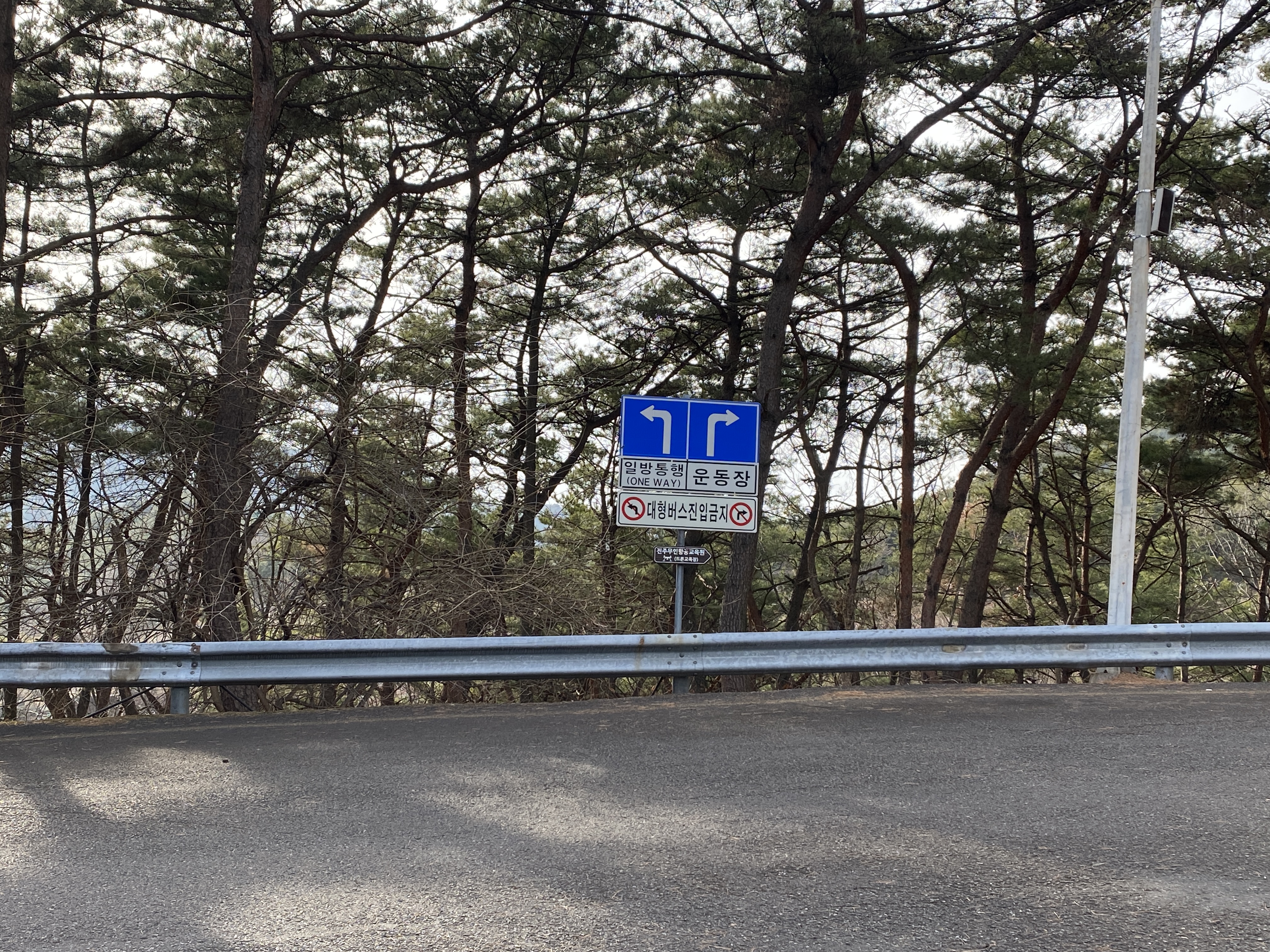 테니스장 근처에서 대학본부에서 내려오는 길과 이어집니다. 근데 테니스장으로 내려가는 길의 커브가 상당히 심합니다. 그래서 버스의 진입을 금지시켰으리라 생각되네요. 일단 운동장 방향으로 올라가 보죠.