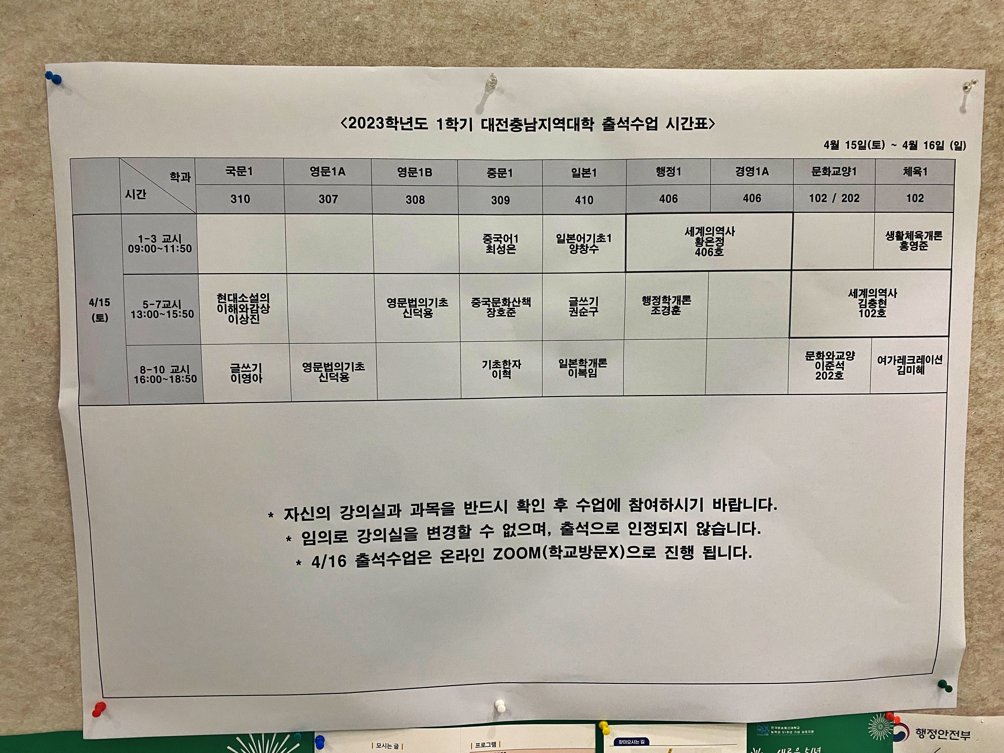 각 과목별 출석수업 시간표가 로비에 붙여져 있습니다.