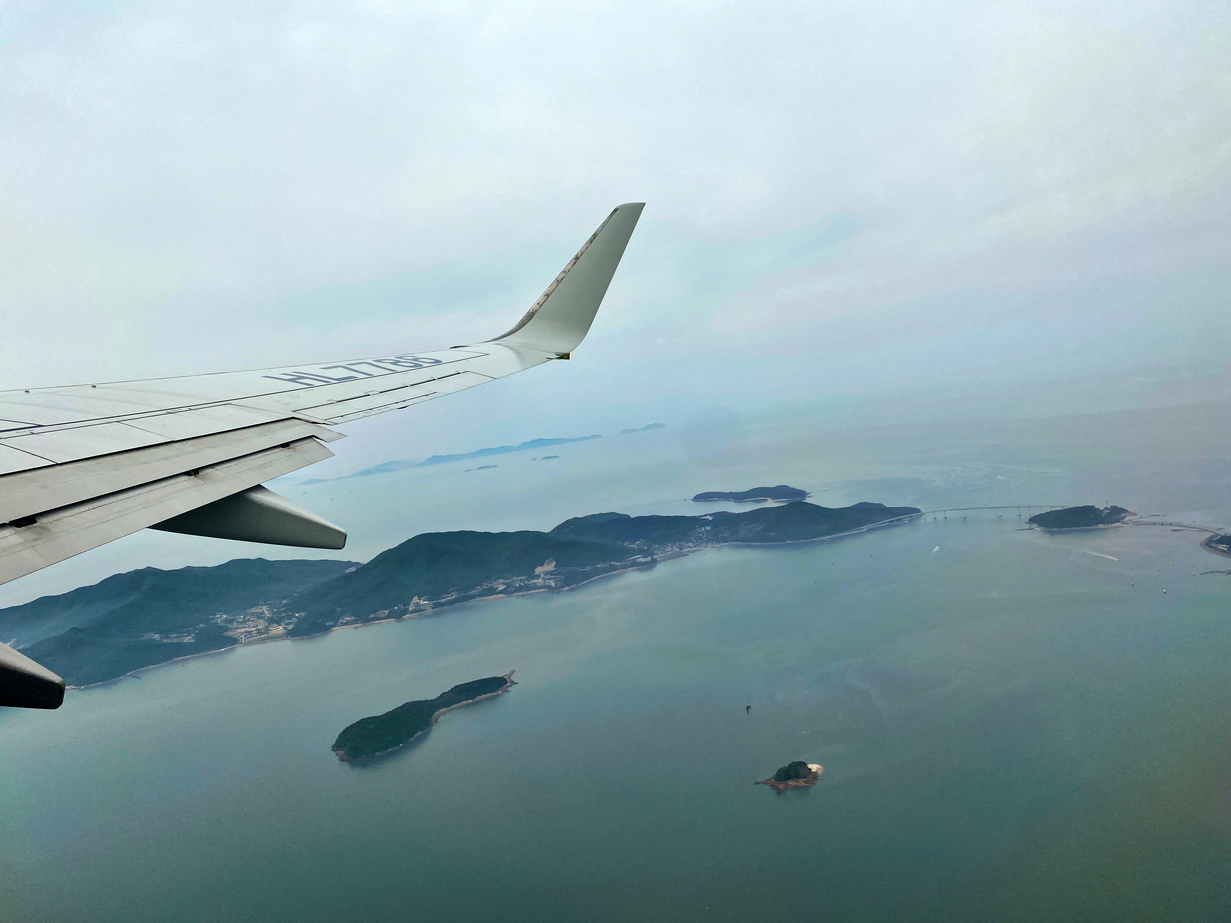 아래에 길쭉하게 작은 무인도는 사렴도. 그 앞에 작은 섬은 매도라고 하네요. 고도를 높이기 전 마지막으로 봤던 풍경들이 죄다 이런 인천공항 근처의 섬들입니다.