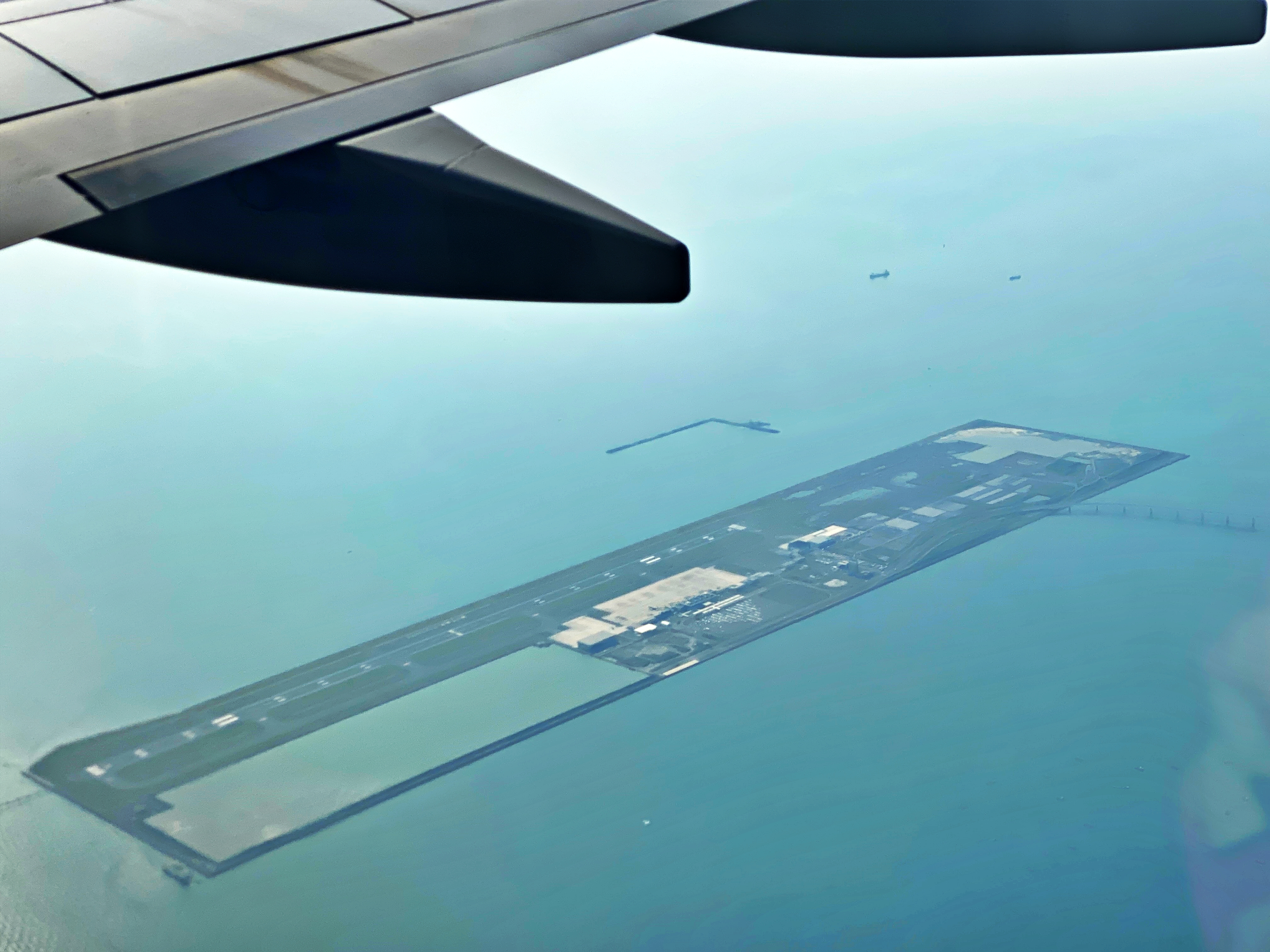 진짜 바다 한복판에 있습니다. 저게 끝입니다. 후쿠오카 공항의 포화로 2006년 개항한 기타큐슈 공항은 24시간 운영을 목표로 바다 한복판에 지어졌다고 합니다. 위에서 내려보니 작아 보이지만 매립지는 상당히 큰 편이고요. 배후 상업시설은 토요코인 하나 말곤 없다고 합니다.