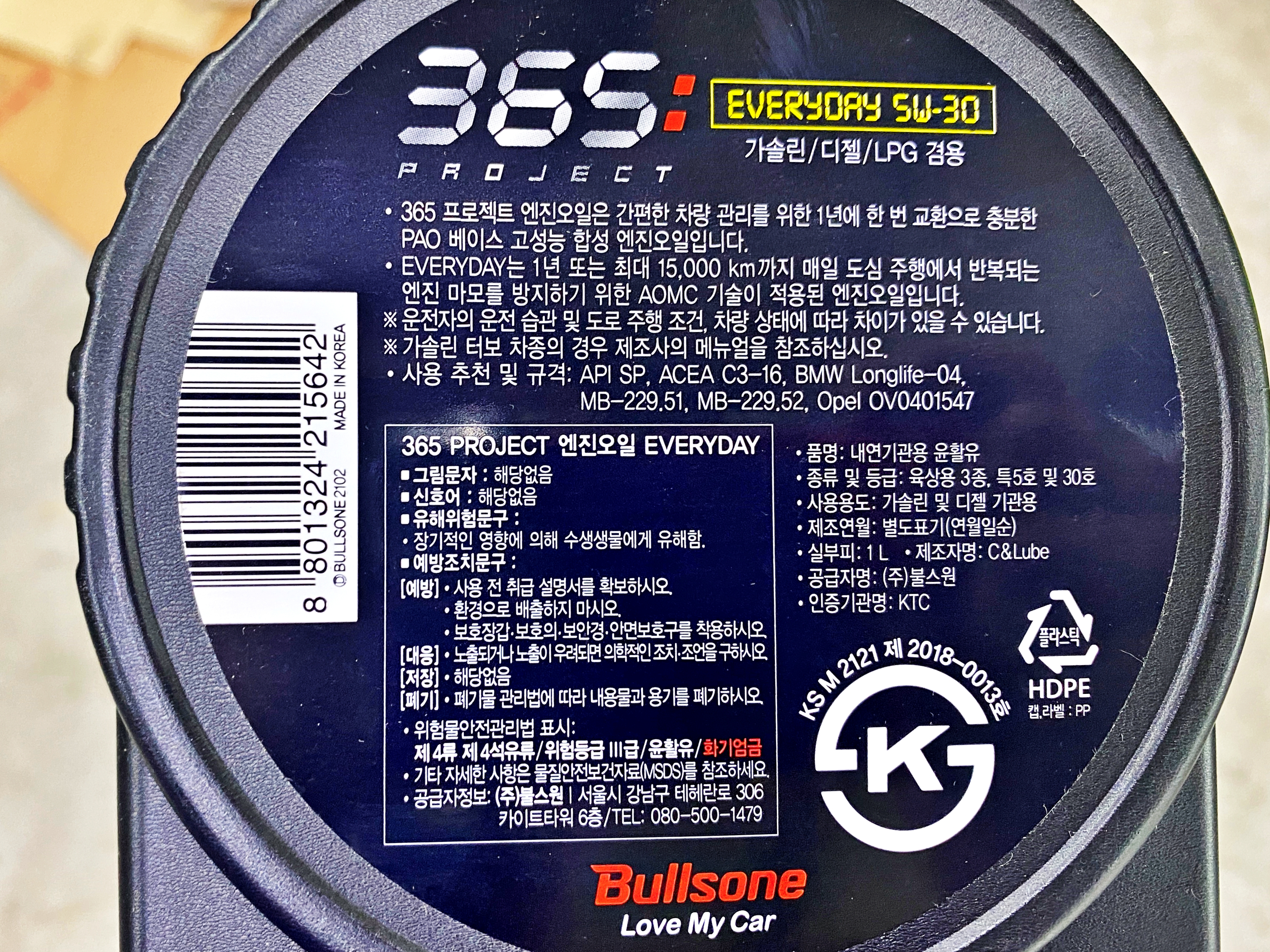 불스원 상표를 붙여 OEM으로 생산되는 엔진오일이고, 안 써본 사람들은 불스원에 선입견을 가지고 주저하지만 써 본 사람들은 상당히 만족한다는 평이 대부분입니다. 투싼 역시 한 1년 7천 km 정도 타고 교체했었는데 무난했었고 제가 교체하는 마지막 엔진오일로 낙점되었네요.
