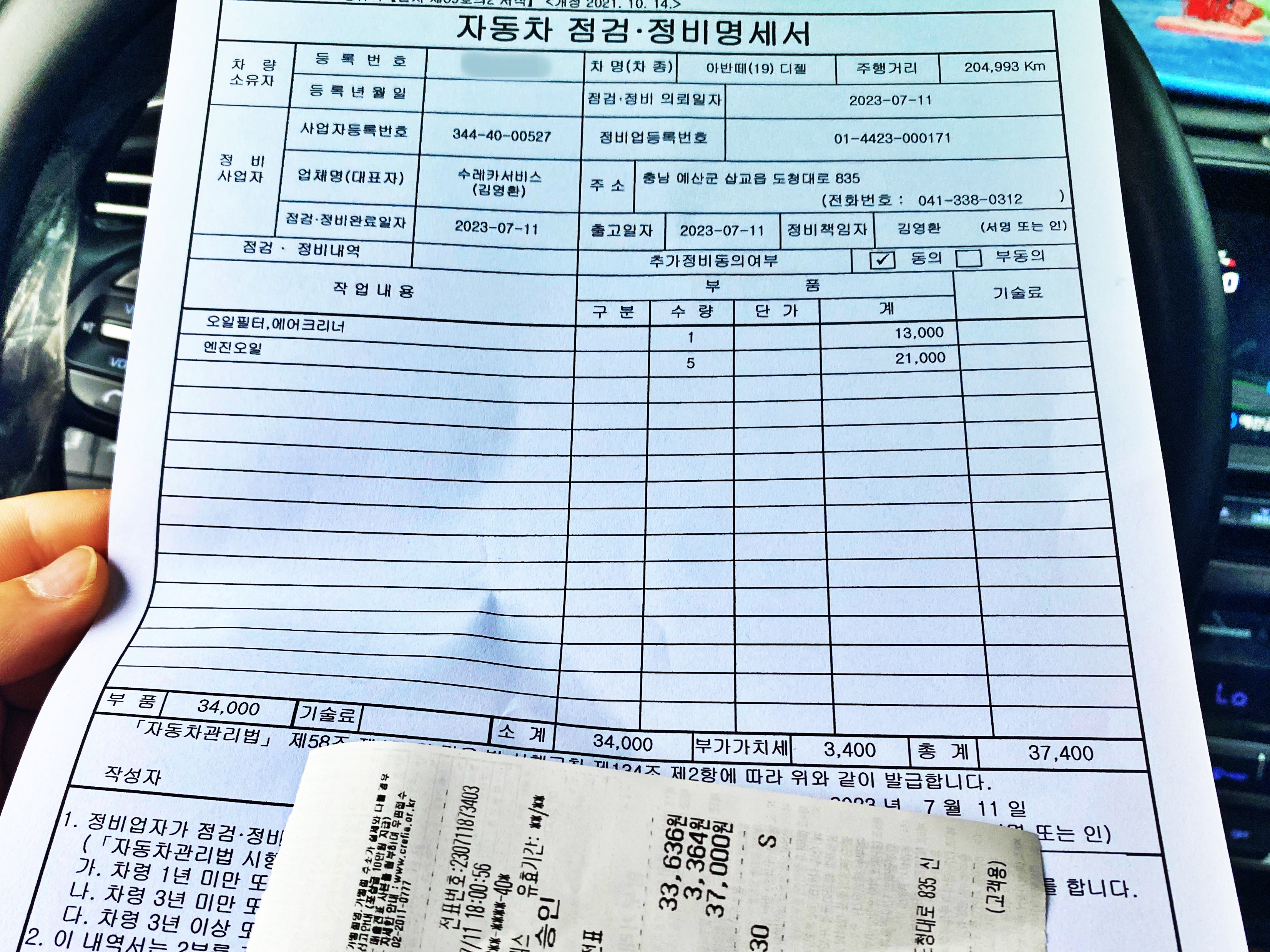총 34,000원에 부가세 포함에 우수리 떼고 37,000원을 결제했습니다. 블루핸즈에 마지막으로 갔었을 때 오일만 들고가서 교체비로 49,400원을 결제하고 왔었네요. 1년 전 일이긴 하지만, 1만원 이상 저렴한 가격에 교체가 가능했습니다.