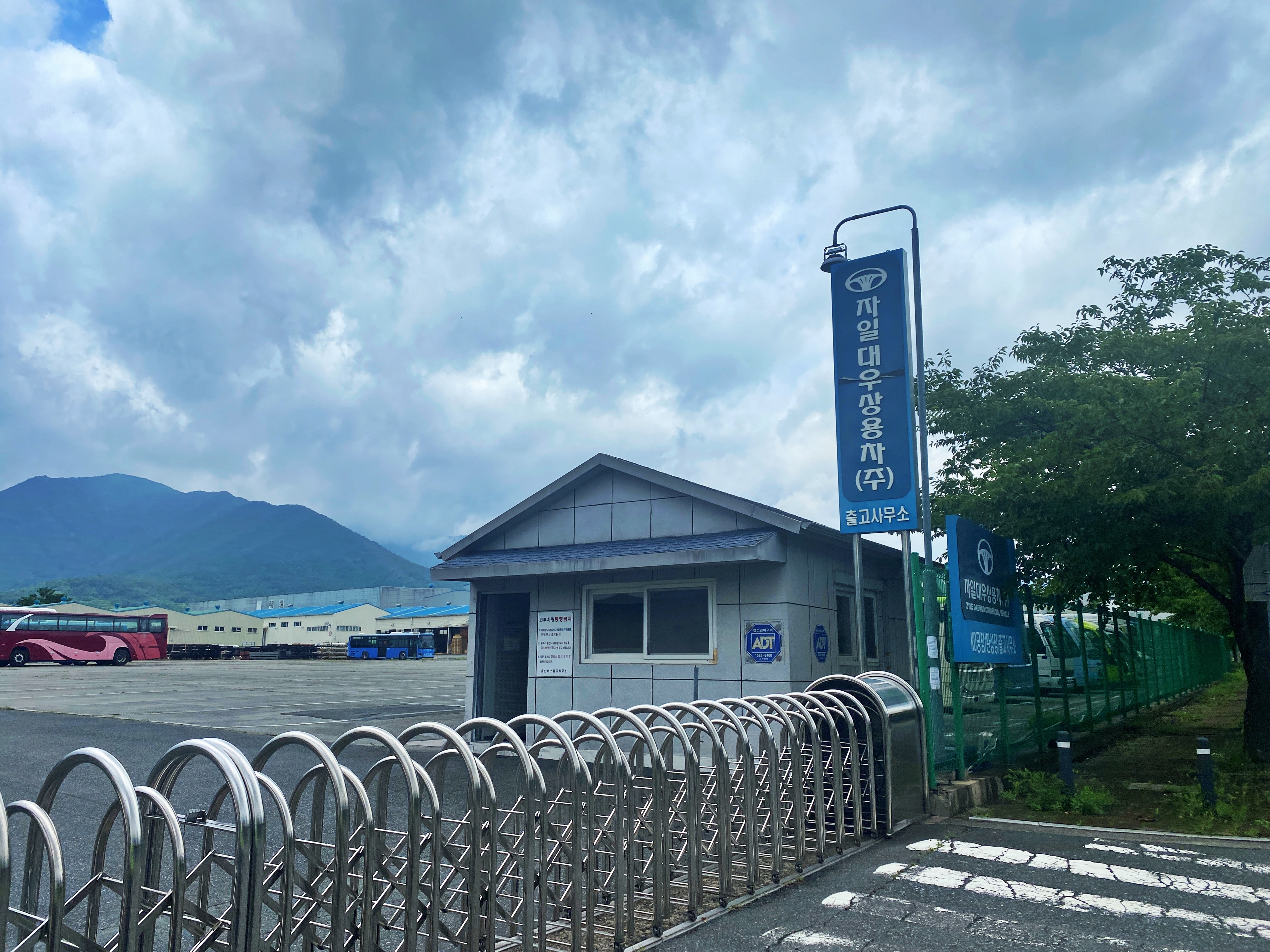한때 버스가 열심히 생산되던 공장은 적막함만 감돌고 있습니다. 정문 앞에 세워진 흰색 카니발은 사람이 타고 있는지 계속 공회전 중이네요.