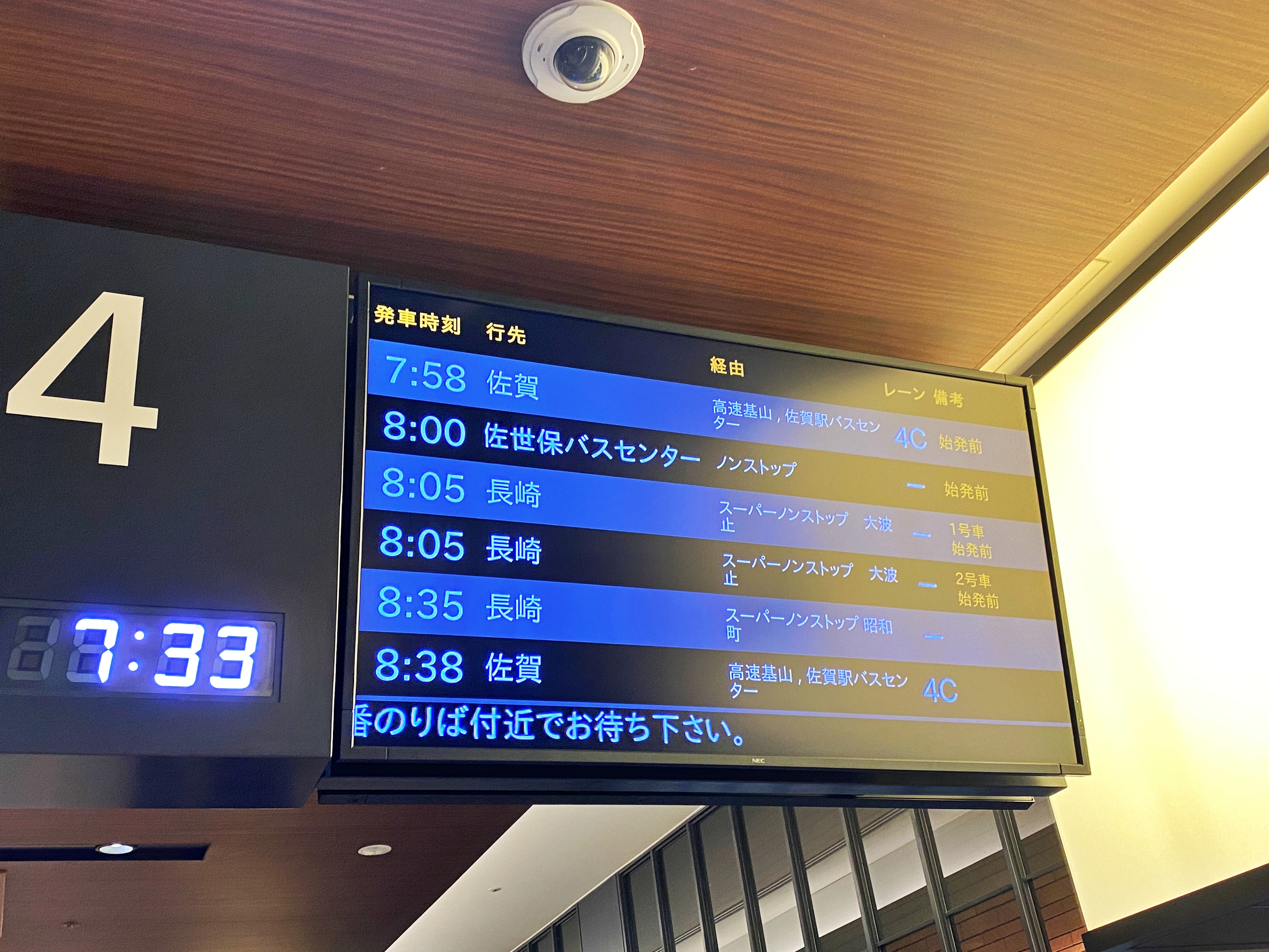 현재 시간 7시 33분. 사가행은 7시 58분에 발차합니다. 이후 사세보행과 나가사키행 버스가 계속 들어오네요. 일반적인 터미널보다는 잠실역 버스환승센터와 분위기가 비슷합니다.