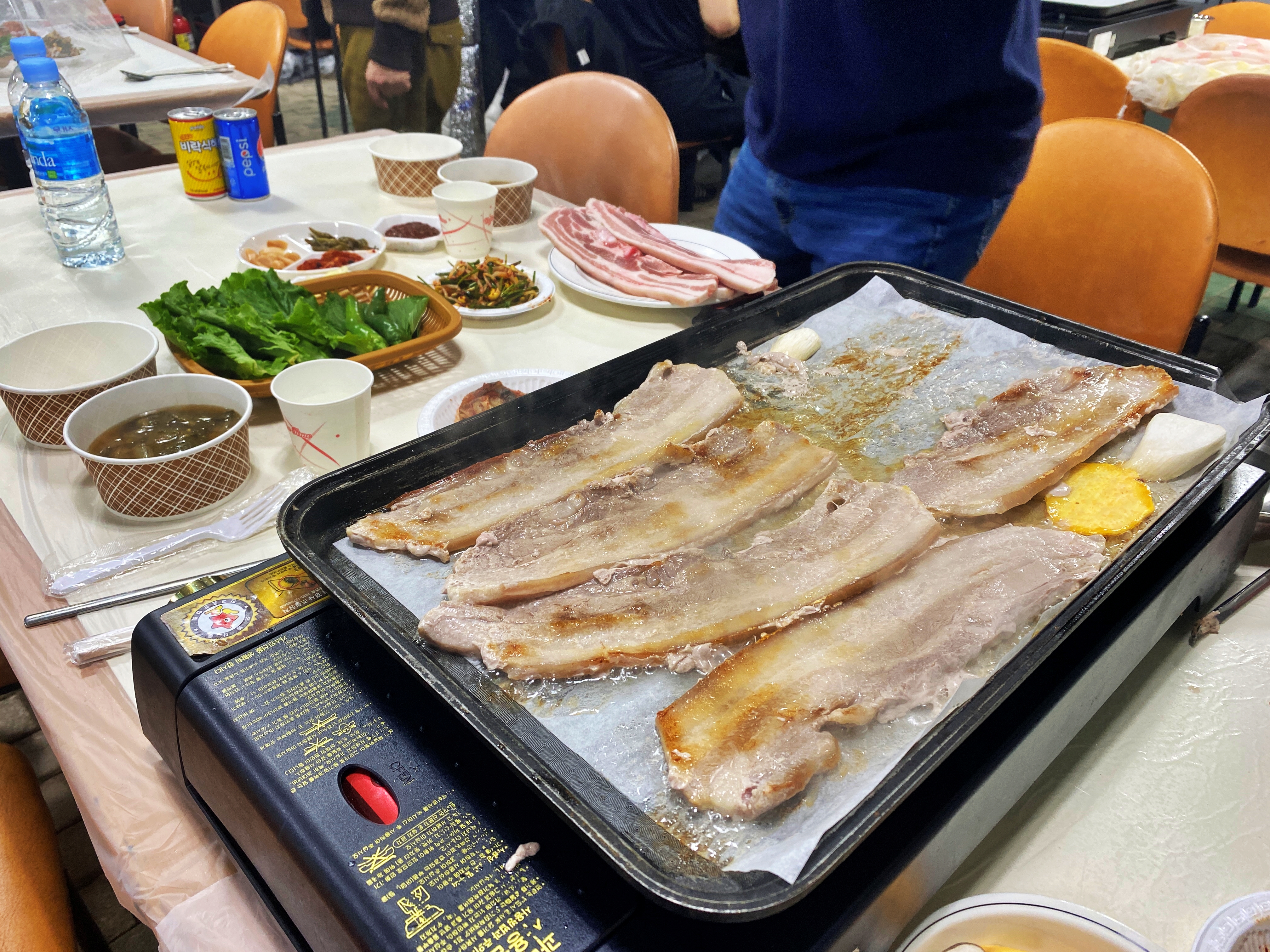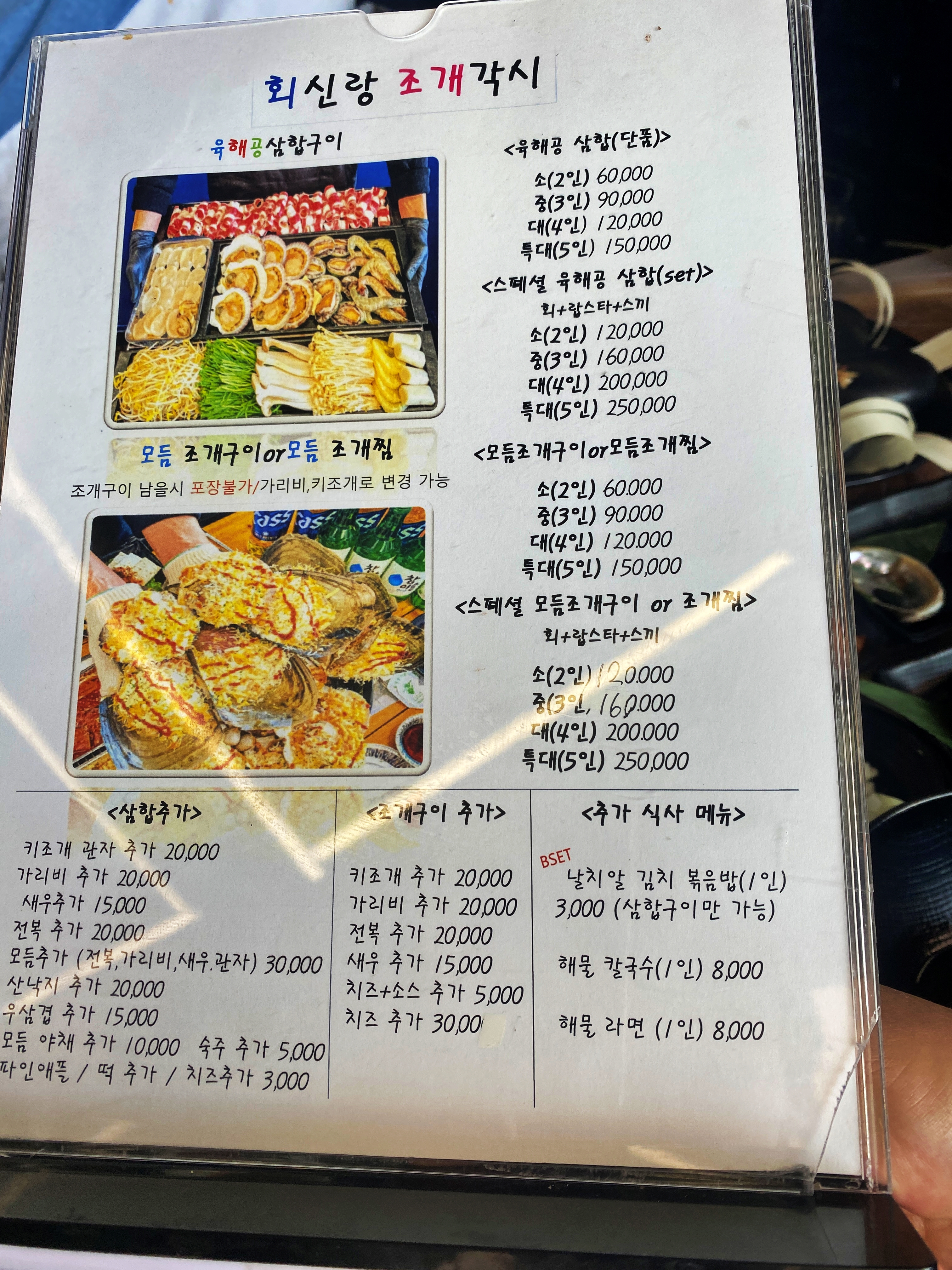 물멍을 때리며 이런저런 이야기를 한 3~40분 정도 나누고 근처 횟집 거리를 돌다 한 횟집에 들어가서 삼합구이를 먹었습니다.