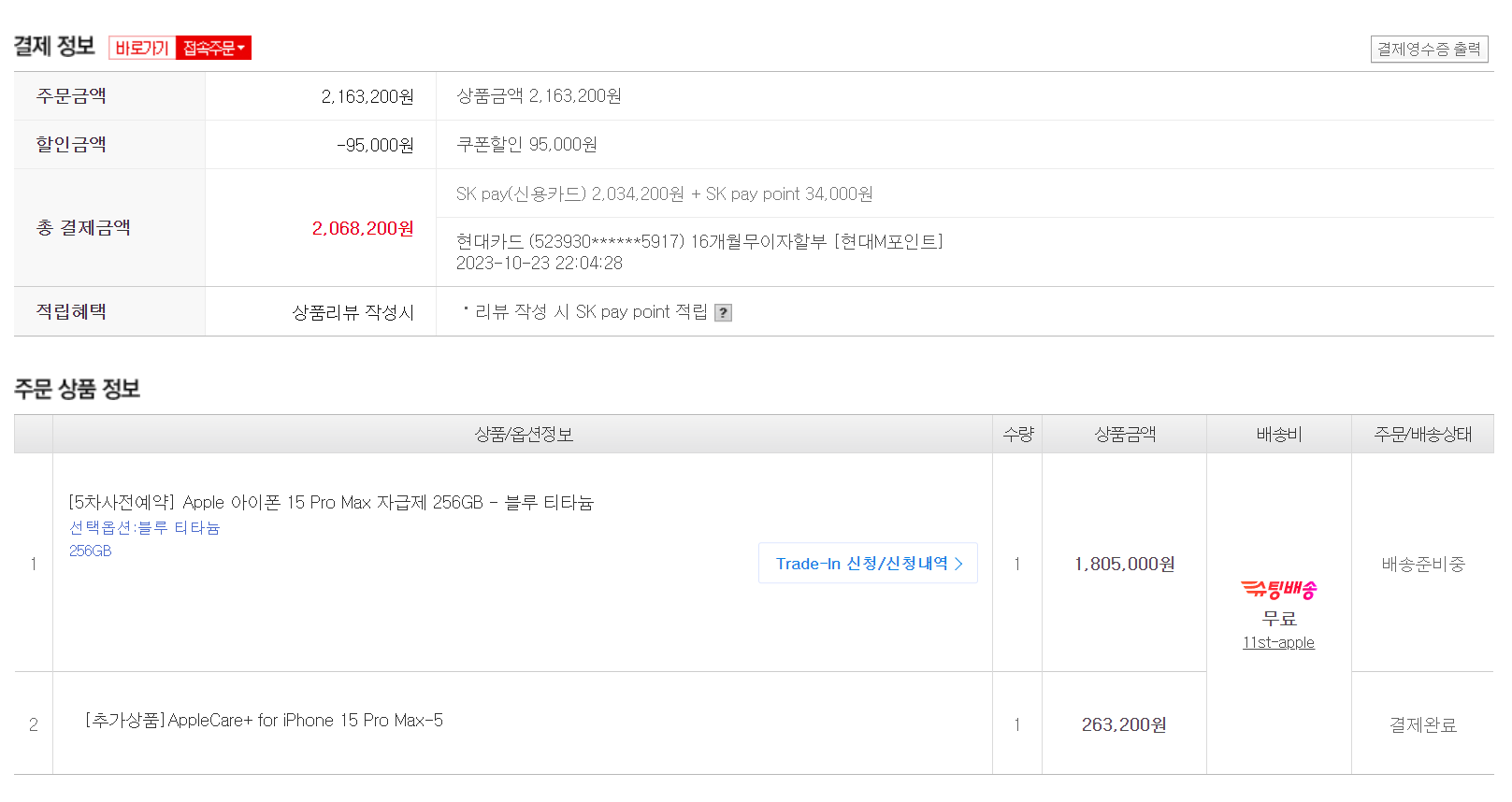 우주패스 slim에 가입하면 즉시 사용 가능한 포인트 34,000점을 준다기에 29,000원을 내고 연간이용권 구입하여 실질적으로 지불한 비용은 2,039,200원이 되겠습니다. 16개월까지 무이자할부가 가능하다기에 16개월 할부를 끊었고요. 배송은 11월 15일쯤 가능하다고 하네요. 특별한 사유가 없다면 주문을 취소하지는 않을 테니 아마 다음 달엔 새 아이폰을 받아볼 수 있겠네요.