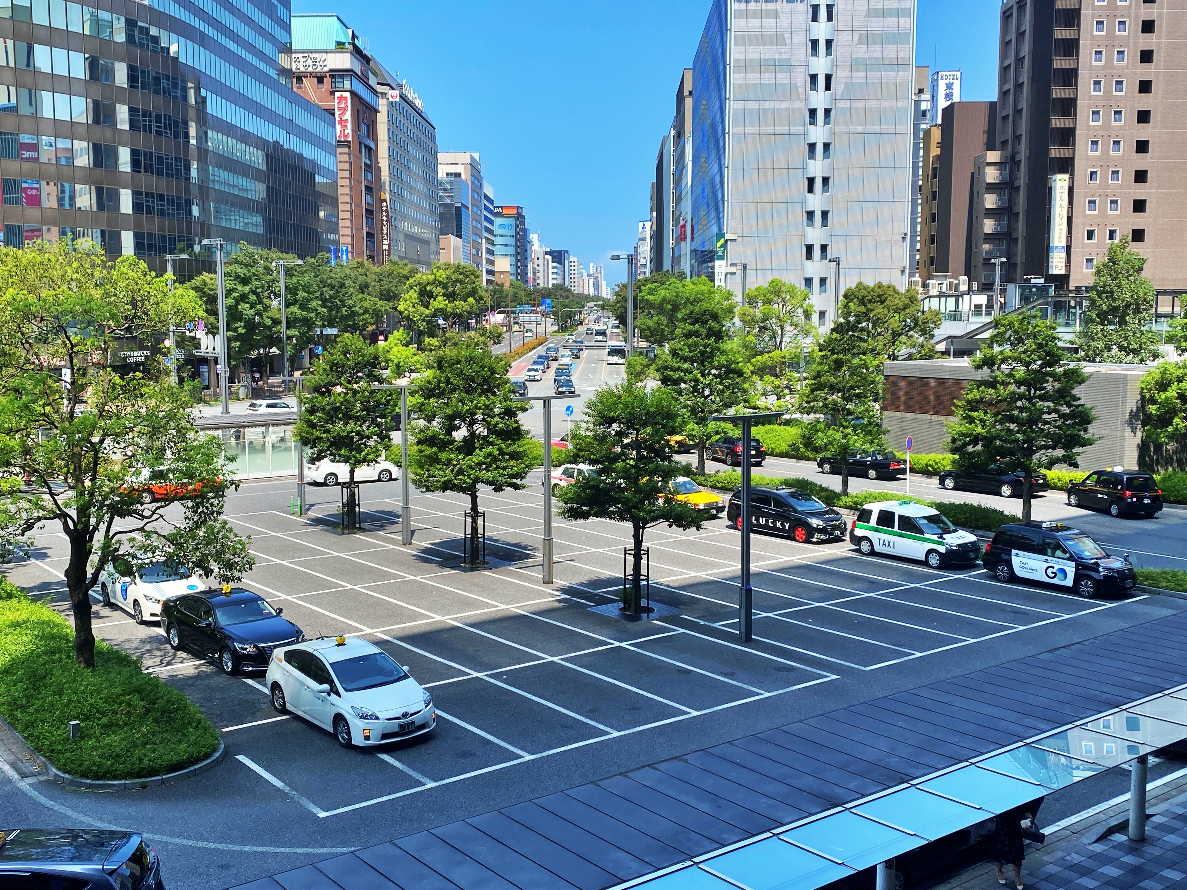 멍 때리며 하카타역 앞 택시승강장의 택시를 구경하네요.