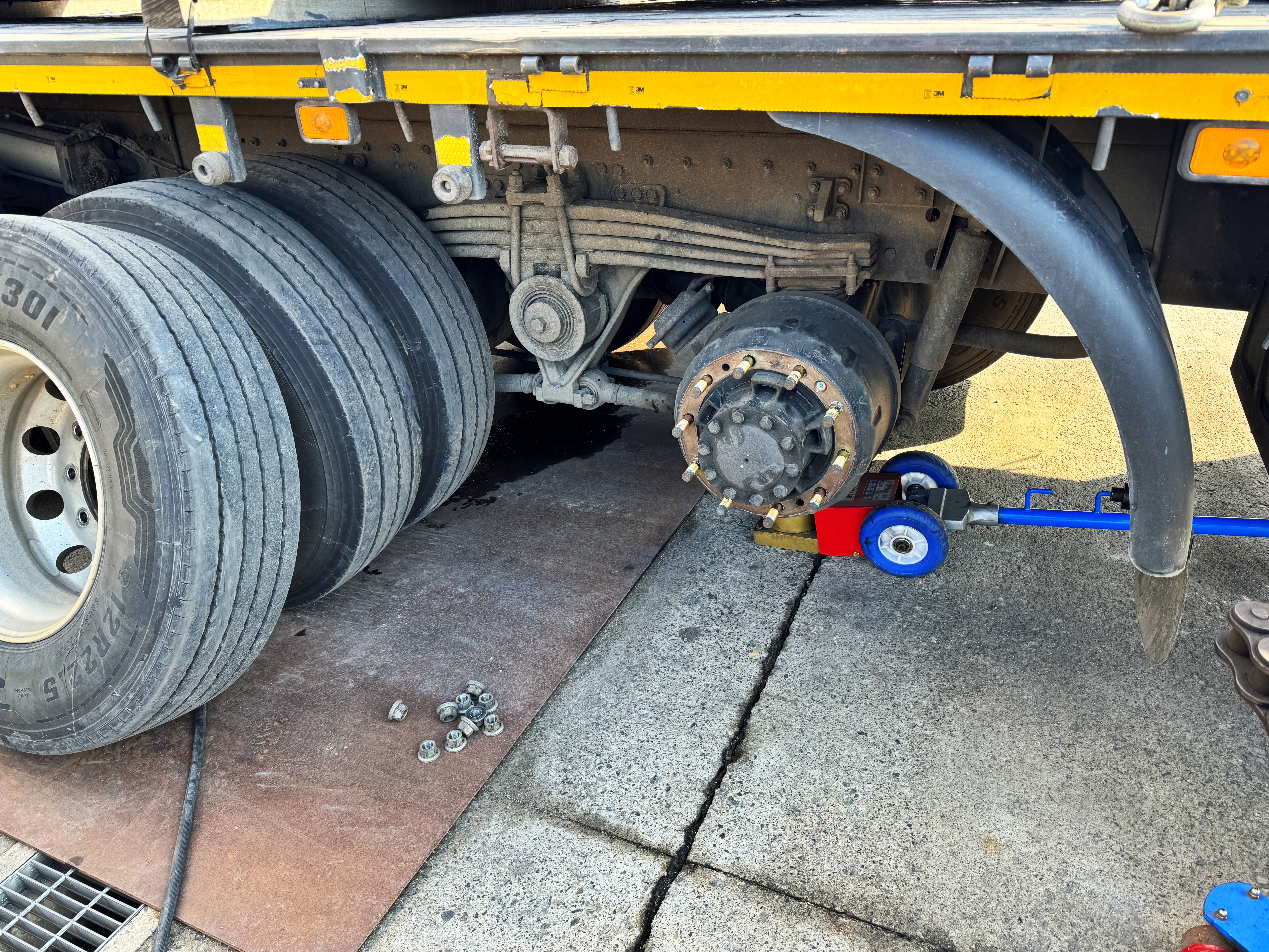작은 못이 박혀서 펑크가 났습니다. 3축을 제외한 1,2,4,5축 타이어를 모두 뜯어내게 되었으며 펑크 수리비까지 지불하게 되었습니다.