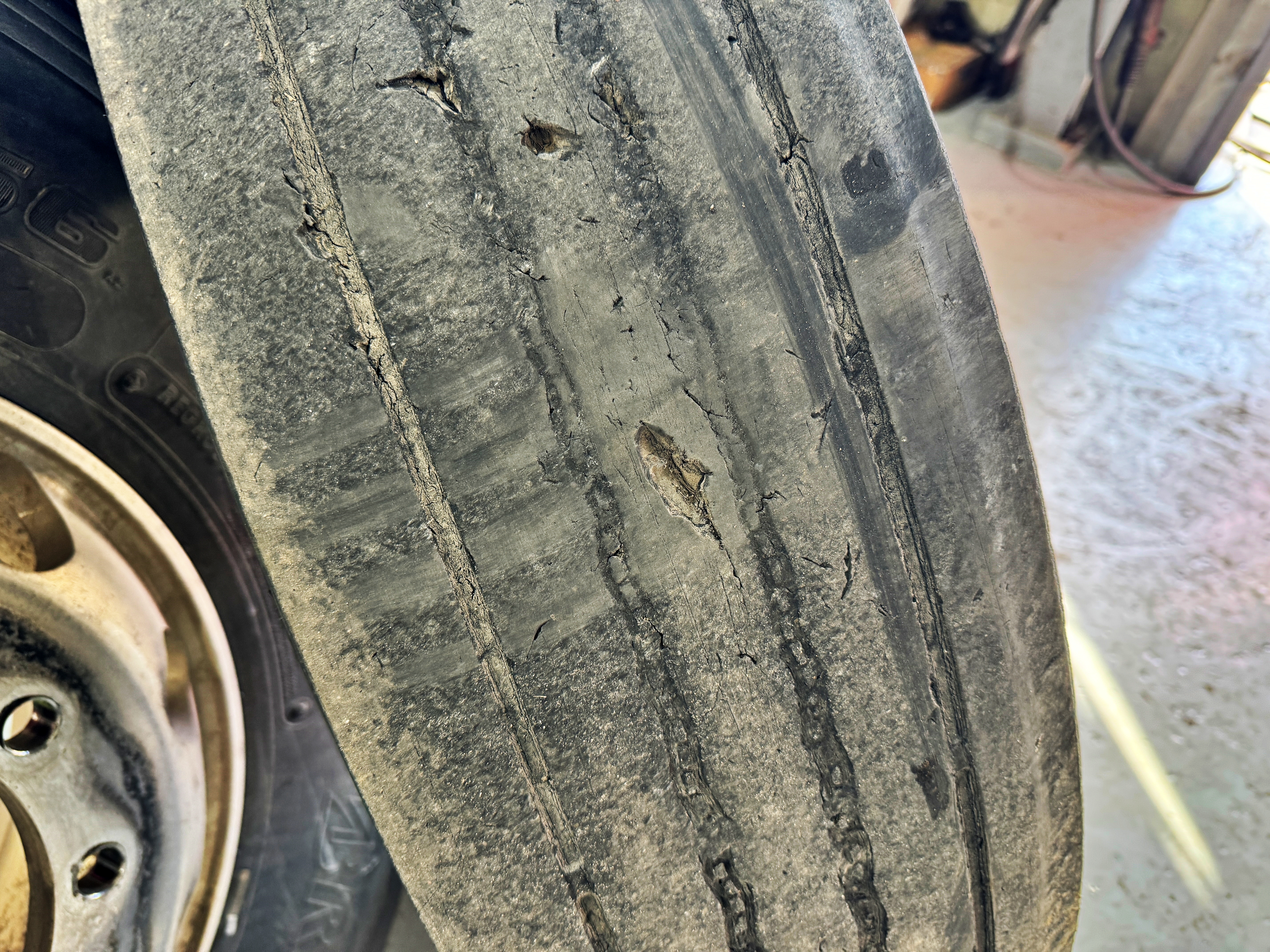 트레드가 아직 많이 남아있습니다. 1,2축 대비 하중을 많이 받는 자리긴 하지만 1년 이상은 무난히 버틸 겁니다. 어느 날 갑자기 터져버리는 불상사가 발생하지 않는다면 빨라야 내년 겨울쯤에 다시 교체한다고 얘기하겠죠.