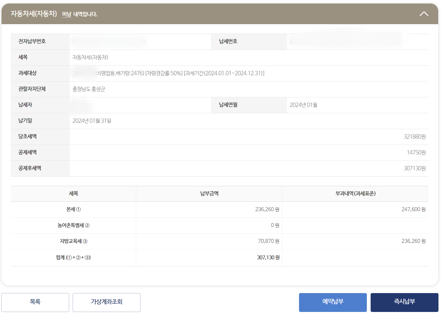 역시나 차령경감률은 50%. 당초세액은 321,880원. 14,750원이 연납으로 공제되어 307,130원을 납부하라고 합니다. 확실히 2476cc의 고배기량 차량이라 1600cc 신차에 준하는 자동차세가 부과됩니다. 거기에 환경개선부담금까지 있으니 훨씬 더 비싸다고 봐야겠죠. 위택스 홈페이지에서 바로 납부해도 되고, 가상계좌를 받아 계좌이체로 납부해도 됩니다.