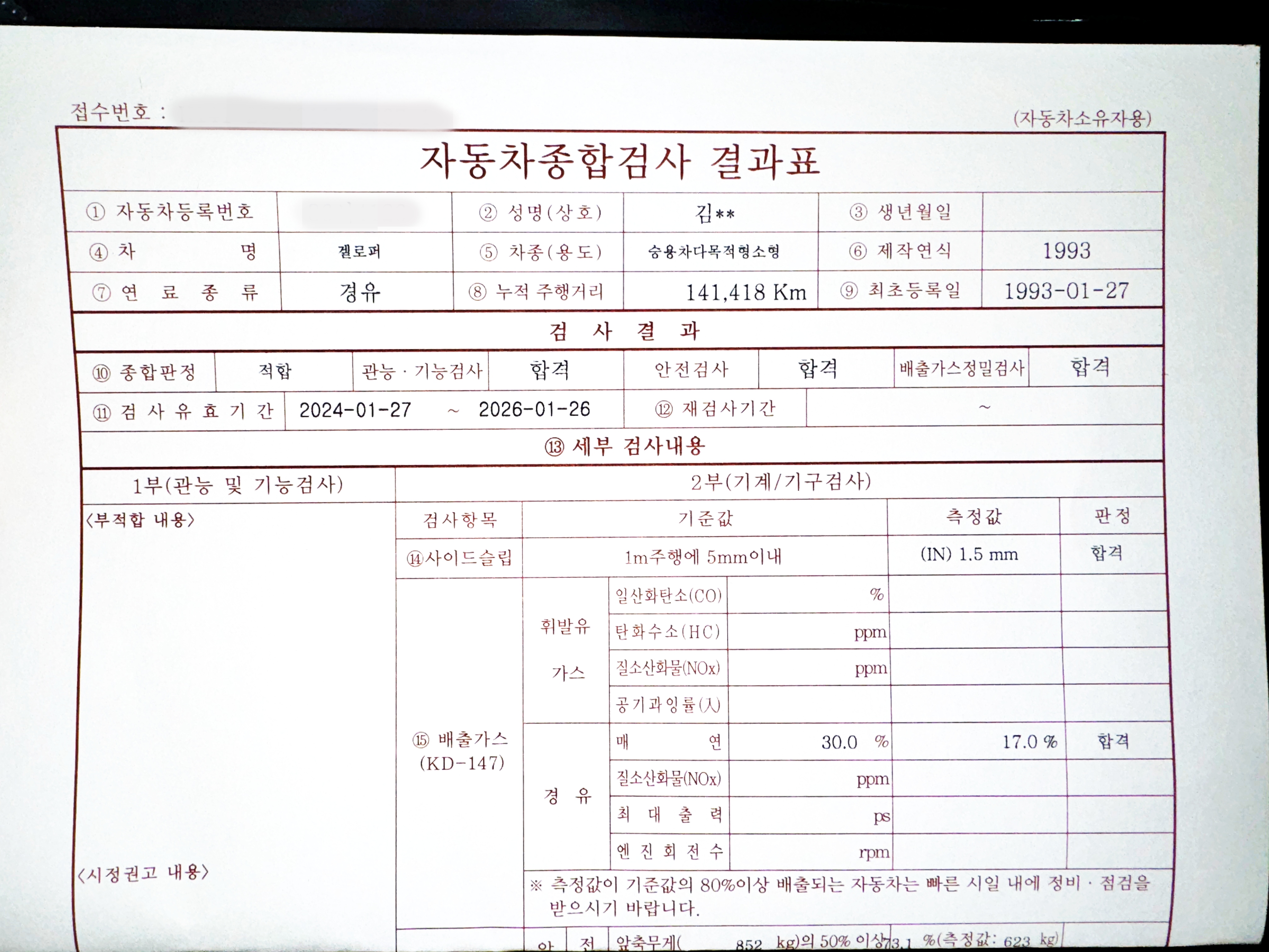 93년 1월 27일에 등록되었으니 곧 31세 생일을 맞이하는 빨간 갤로퍼의 검사기간이 도래하였습니다.