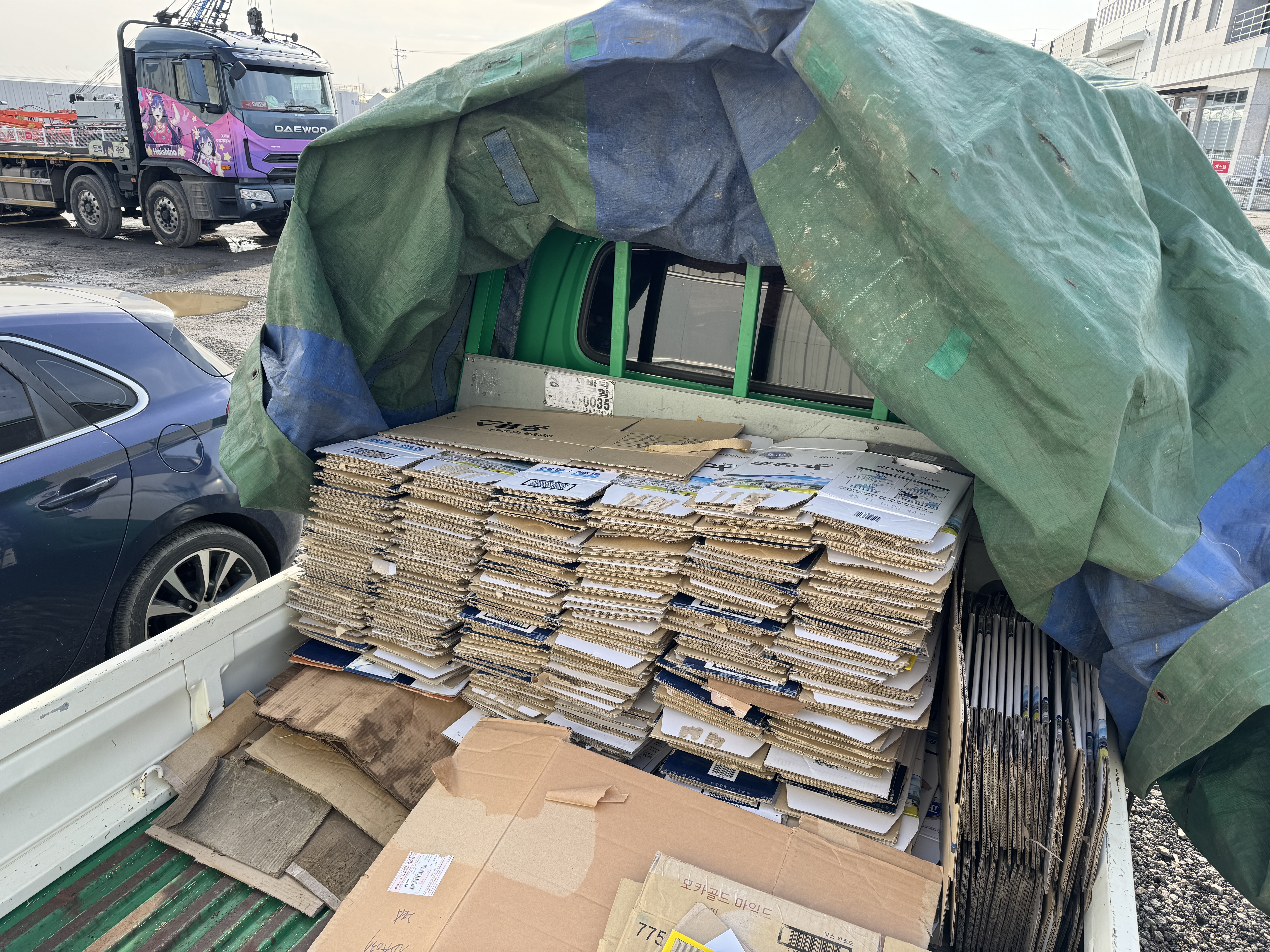 제치가 아니라 엉성하긴 한데 저렇게 씌워놓고 박스를 주워 적재함에 던져놓으니 날아가지도 않고 좋더군요. 그렇게 박스를 줍고 또 주운 뒤 정리하여 적재함에 차곡차곡 박아놓았고, 다음날 낮에 시간이 생겨 고물상에 다녀오기로 합니다.